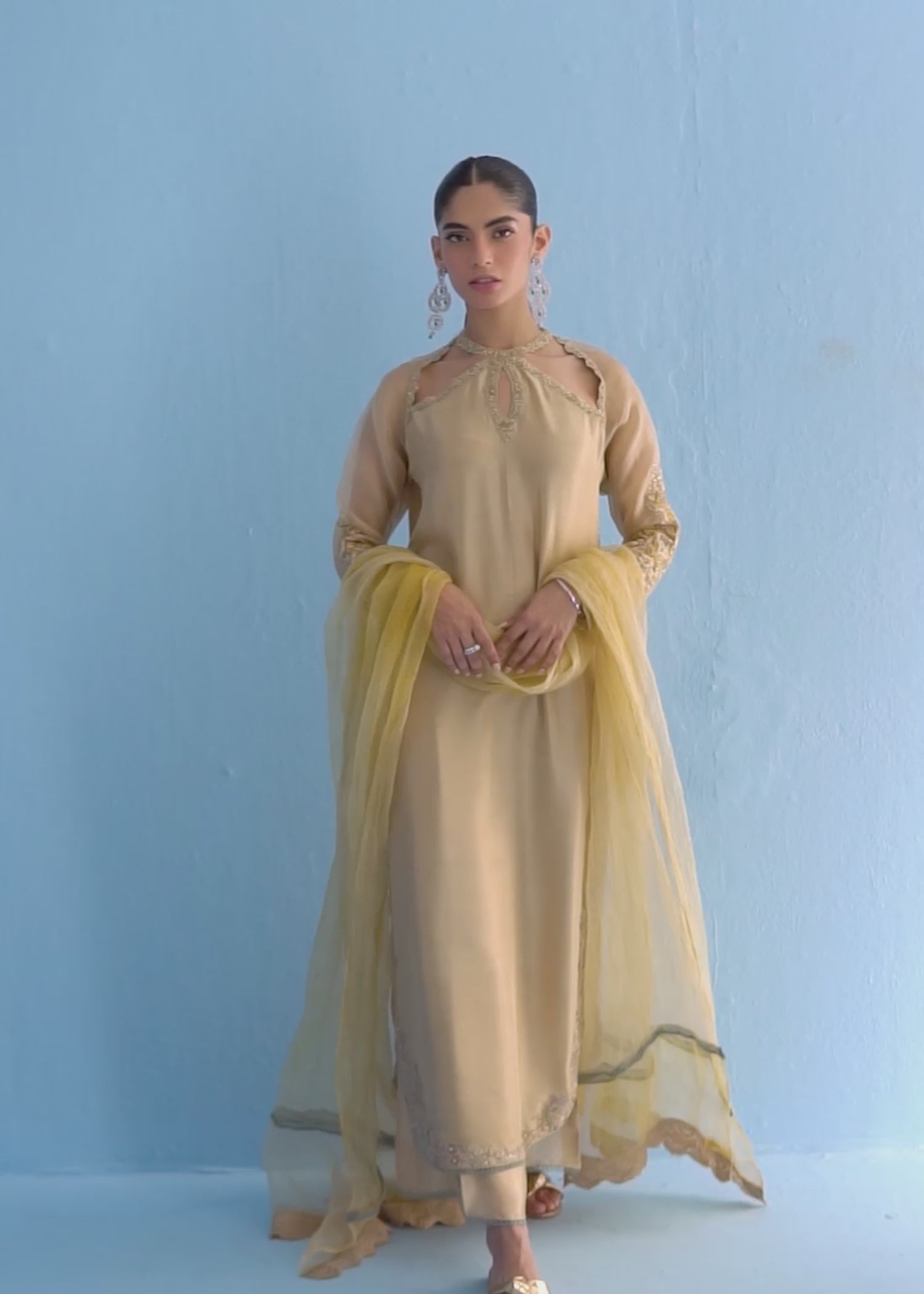 Step into sheer elegance with this masterpiece, boasting vibrant Resham work delicately adorning the sides, infusing a burst of captivating hues. The intricately crafted cutwork neckline adds an exquisite touch, drawing attention to its particular craftsmanship. Paired with pure silk culottes, it exudes refinement. The ensemble is completed with a pure tie and dye organza dupatta detailed with timeless elegance.
