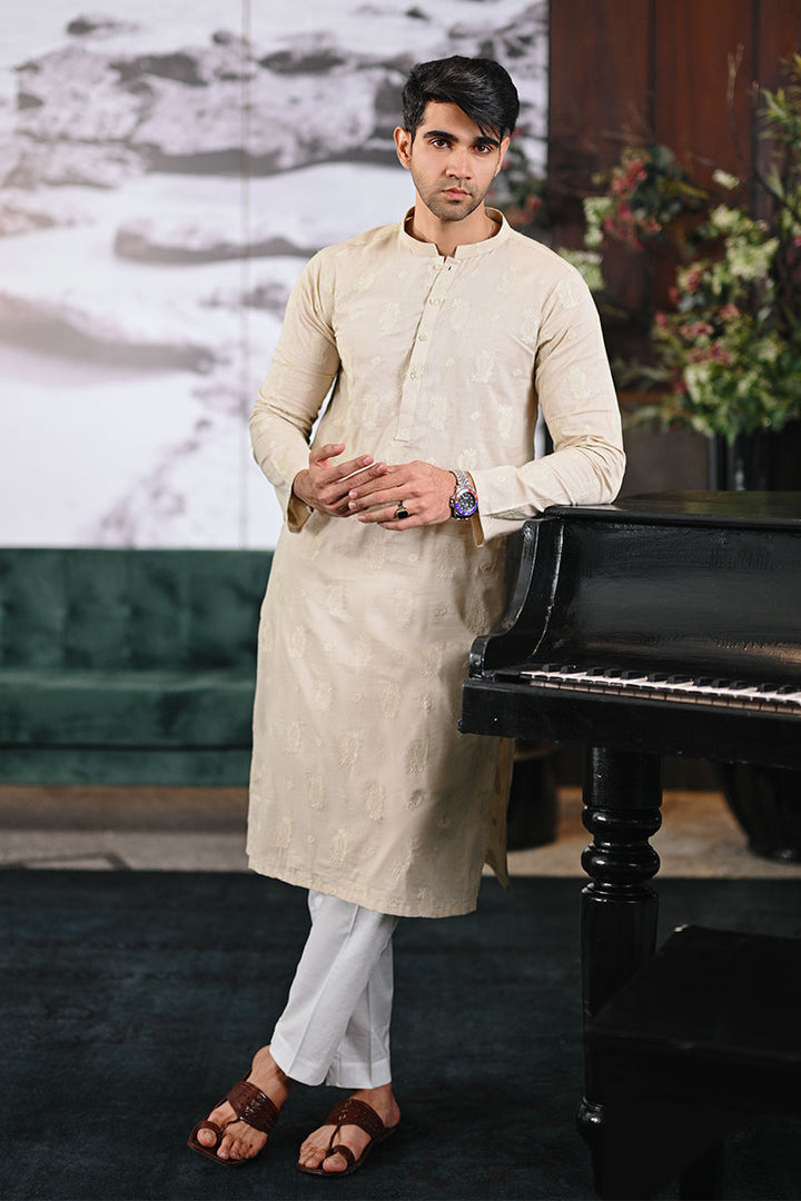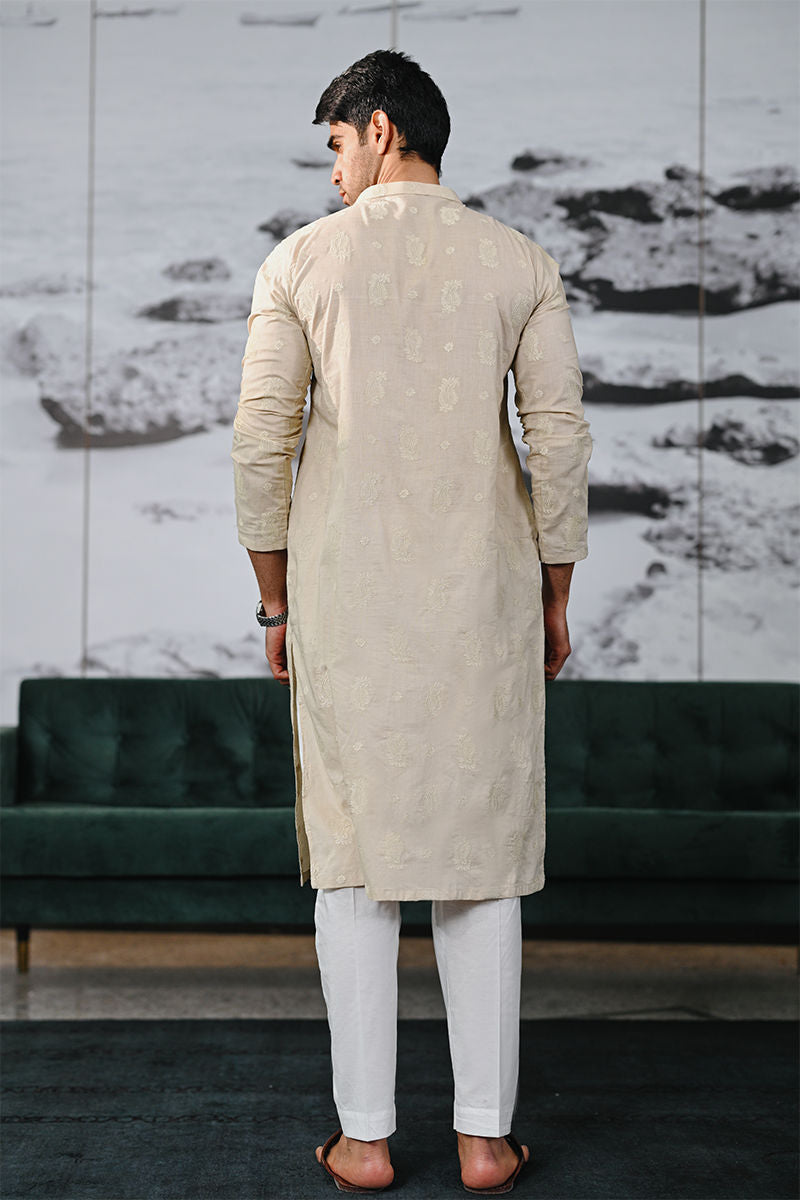 A refined cream cotton kurta with intricate self-embroidery, perfectly paired with crisp white pants. Elevate your elegance effortlessly.