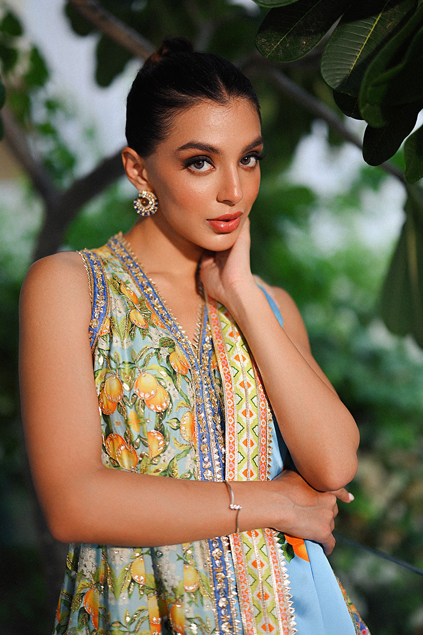 Regal meets contemporary in a sky blue, khaddi silk and charmeuse pre draped sari elevated with a playful lemon print and contrasting border. The charmeuse sari drapes like a dream and when paired with a khaddi silk peplum top, it embodies our ethos of integrating theatrics with effortless style. The peplum top features a striking lemon print with embroidered bird motifs and gota details complemented by an applique border.