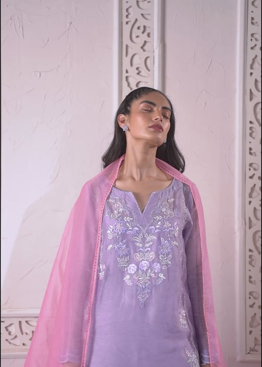 A short straight-cut shirt with a soft U-hemline and fine resham embroidery on the neckline, styled with fluid pants and an organza dupatta detailed with embroidered pallus.