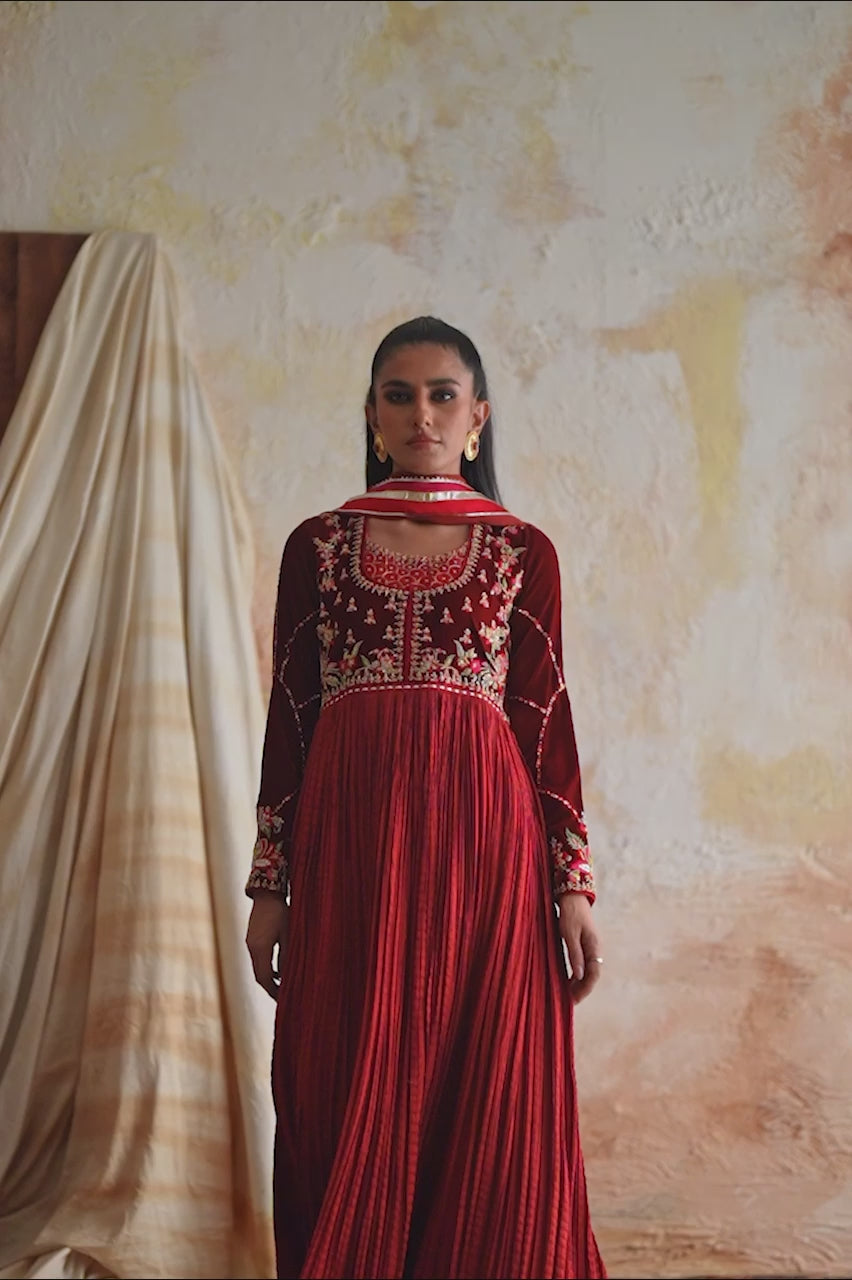 Step into regal elegance with this rust velevt choli peshwas perfect for some festive dholki fun. The choli dazzles with rich resham and zardozi, setting the stage for the opulent crushed lower to dazzle and create the oomph! Completing the royal ensemble is a meticulously crafted silk dupatta adorned with gotta and contrasting trimmings.
