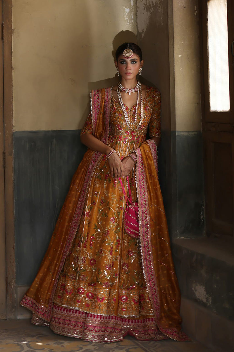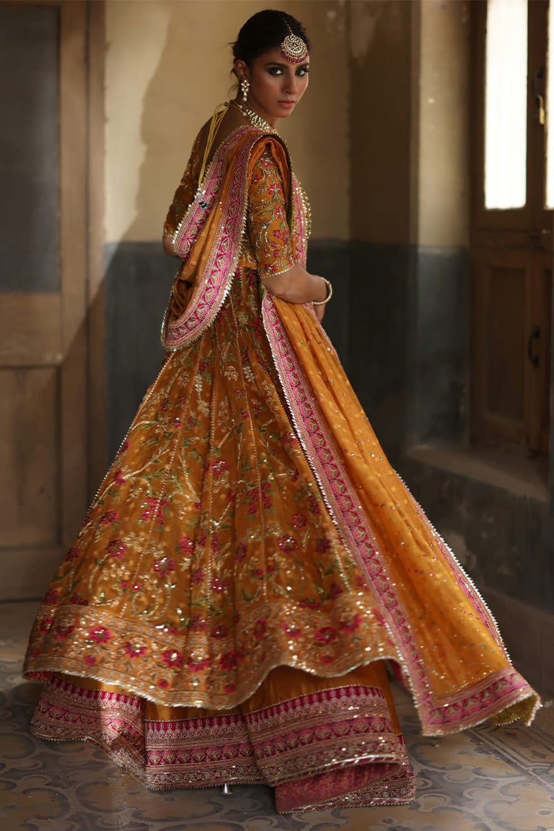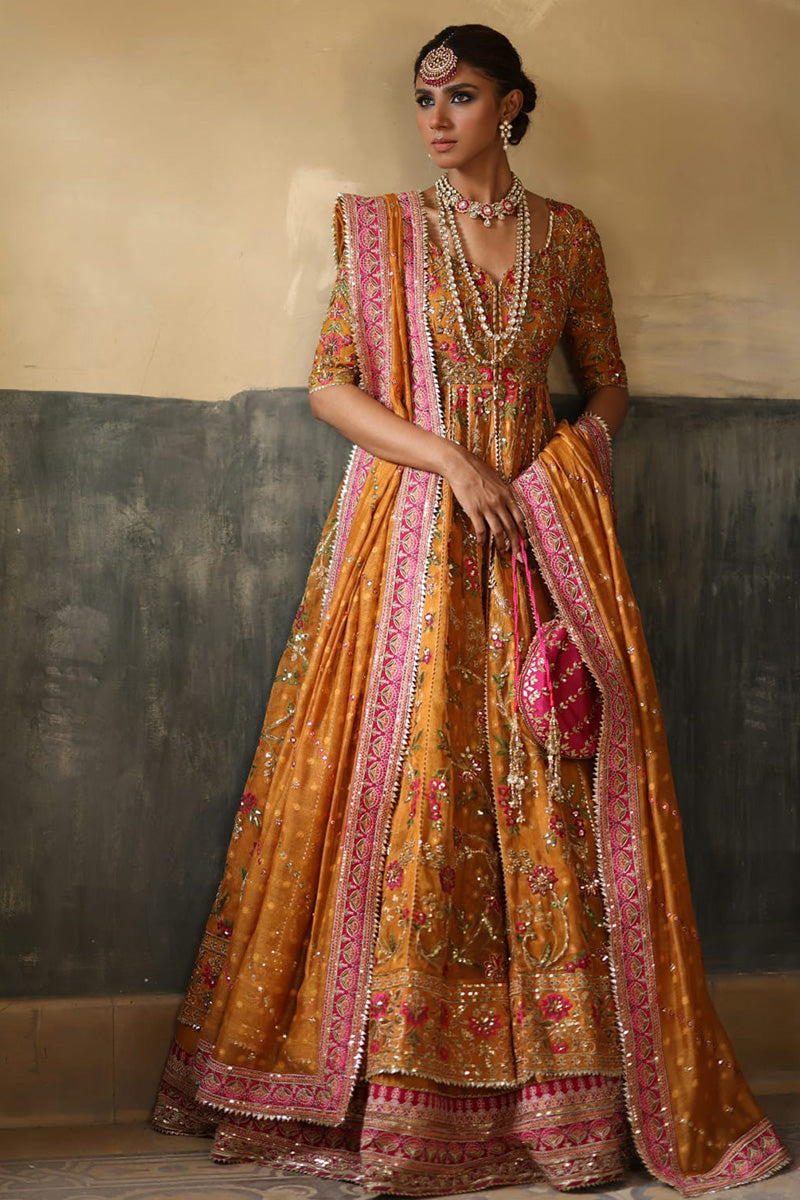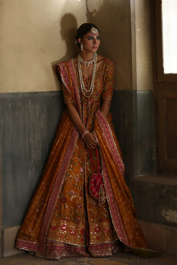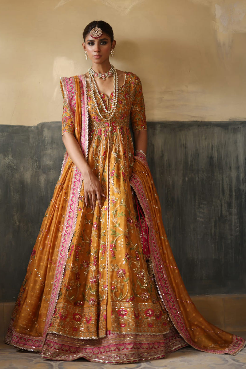 Look straight out of a Mughal fairytale in this pishwaas. The saffron and pink outfit features delicate gold kaam with pink floral details throughout. A heavy glistening gold border anchors the outfit. The pishwaas and dupatta and bag feature contrasting pink and gold kaam to complement the outfit.
