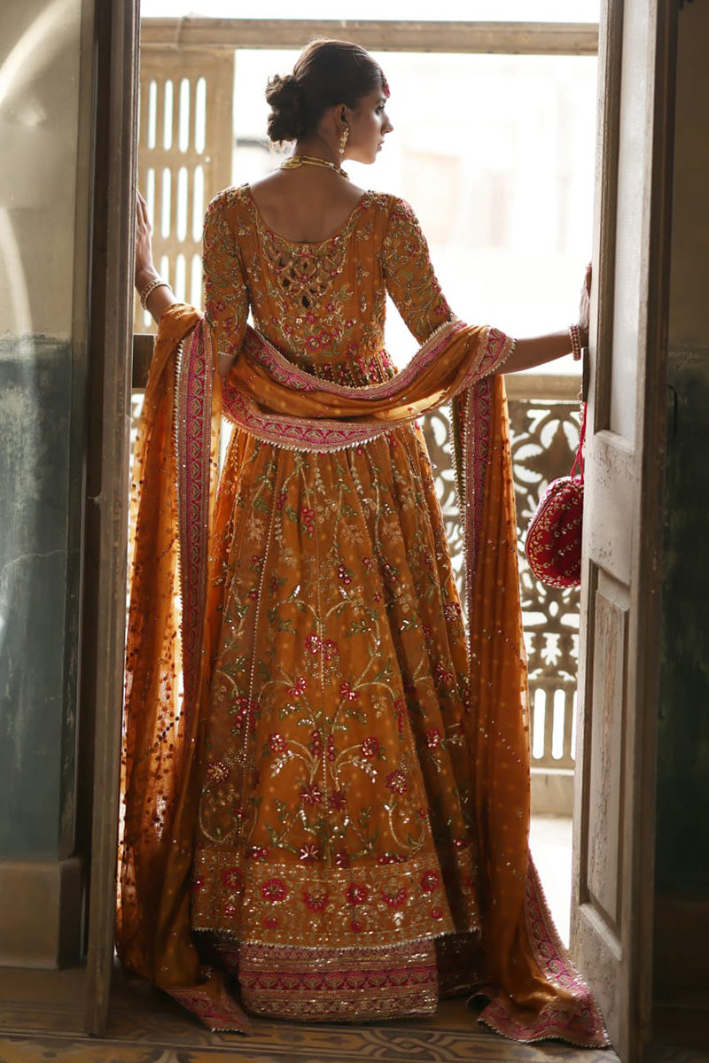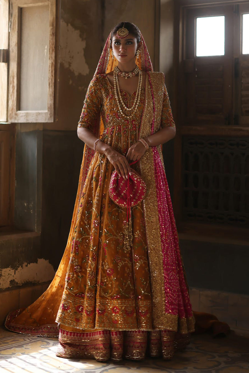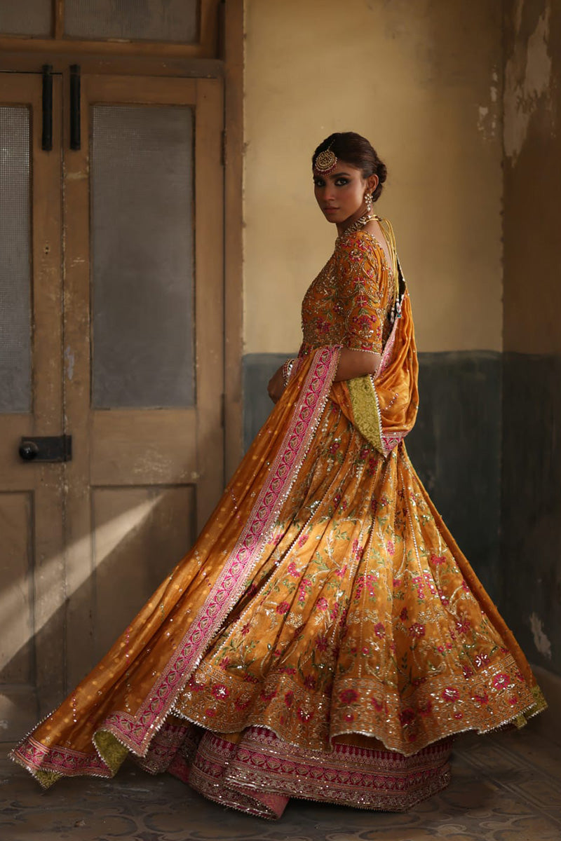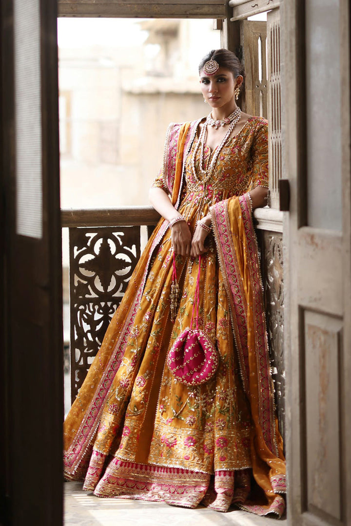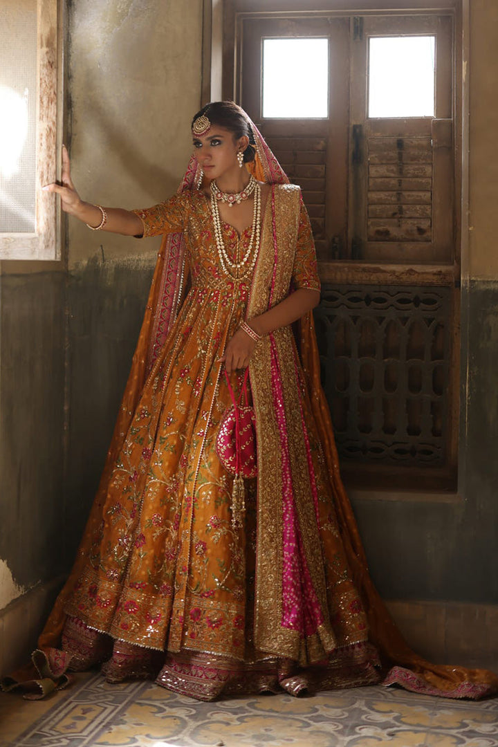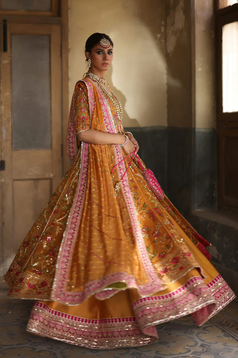 Look straight out of a Mughal fairytale in this pishwaas. The saffron and pink outfit features delicate gold kaam with pink floral details throughout. A heavy glistening gold border anchors the outfit. The pishwaas and dupatta and bag feature contrasting pink and gold kaam to complement the outfit.