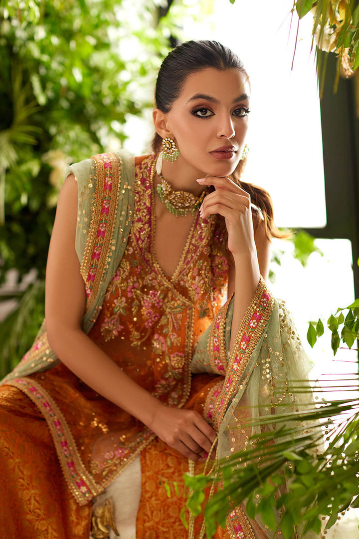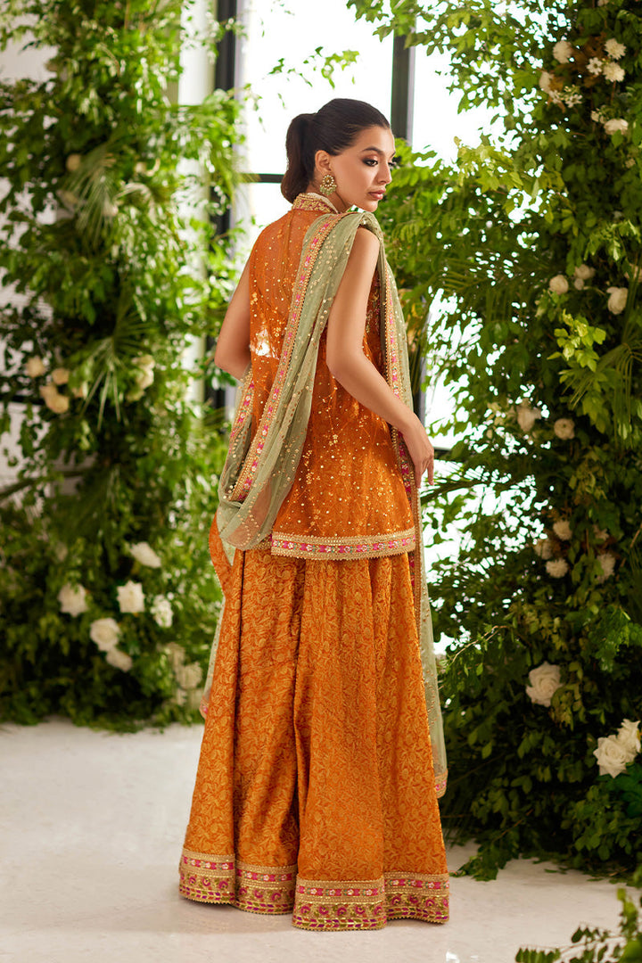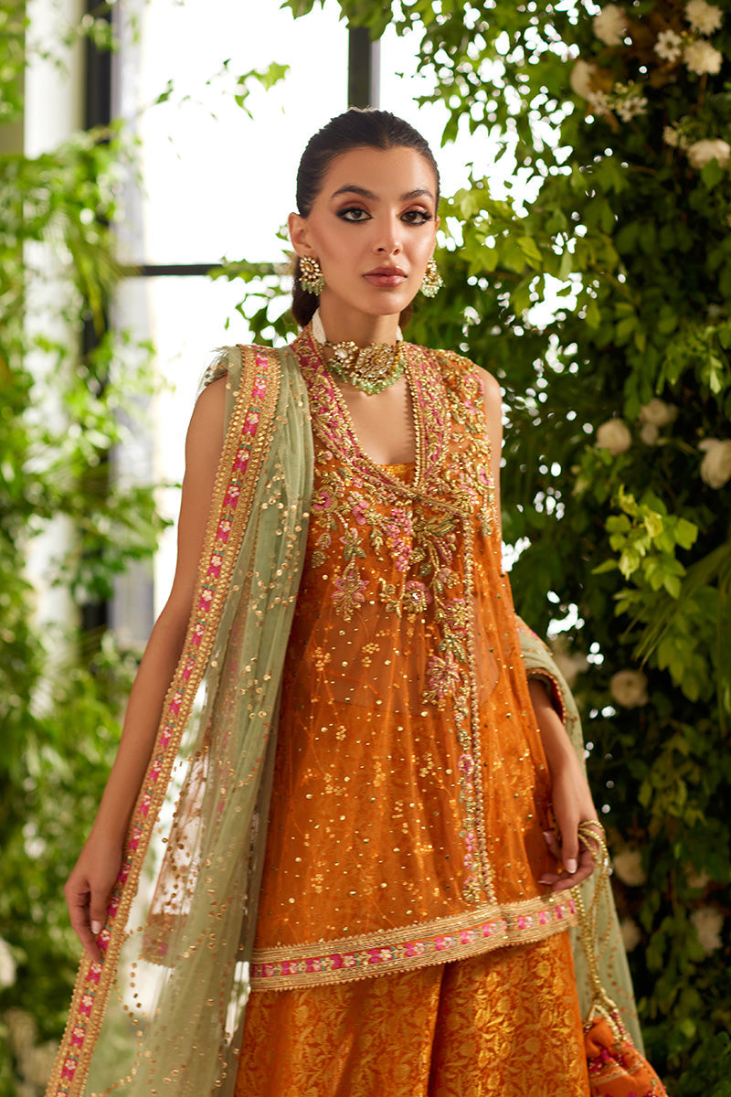 This orange outfit features a short straight shirt with baroque and floral embroideries on the bodice, border and sleeves. The wide leg pants have careful features a subtle floral print and glittering gold and pink borders.