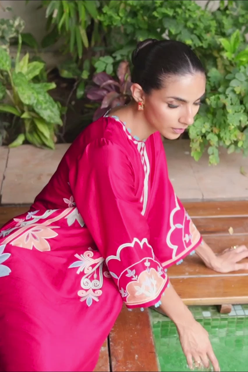 Exuding glamour, a vibrant crimson kaftan is exquisitely embellished with intricate appliqué accents in pastel shades. The split neckline and bell sleeves are introducing playful sophistication to the elegant silhouette.
