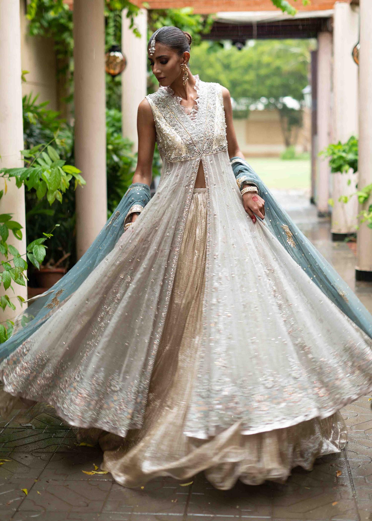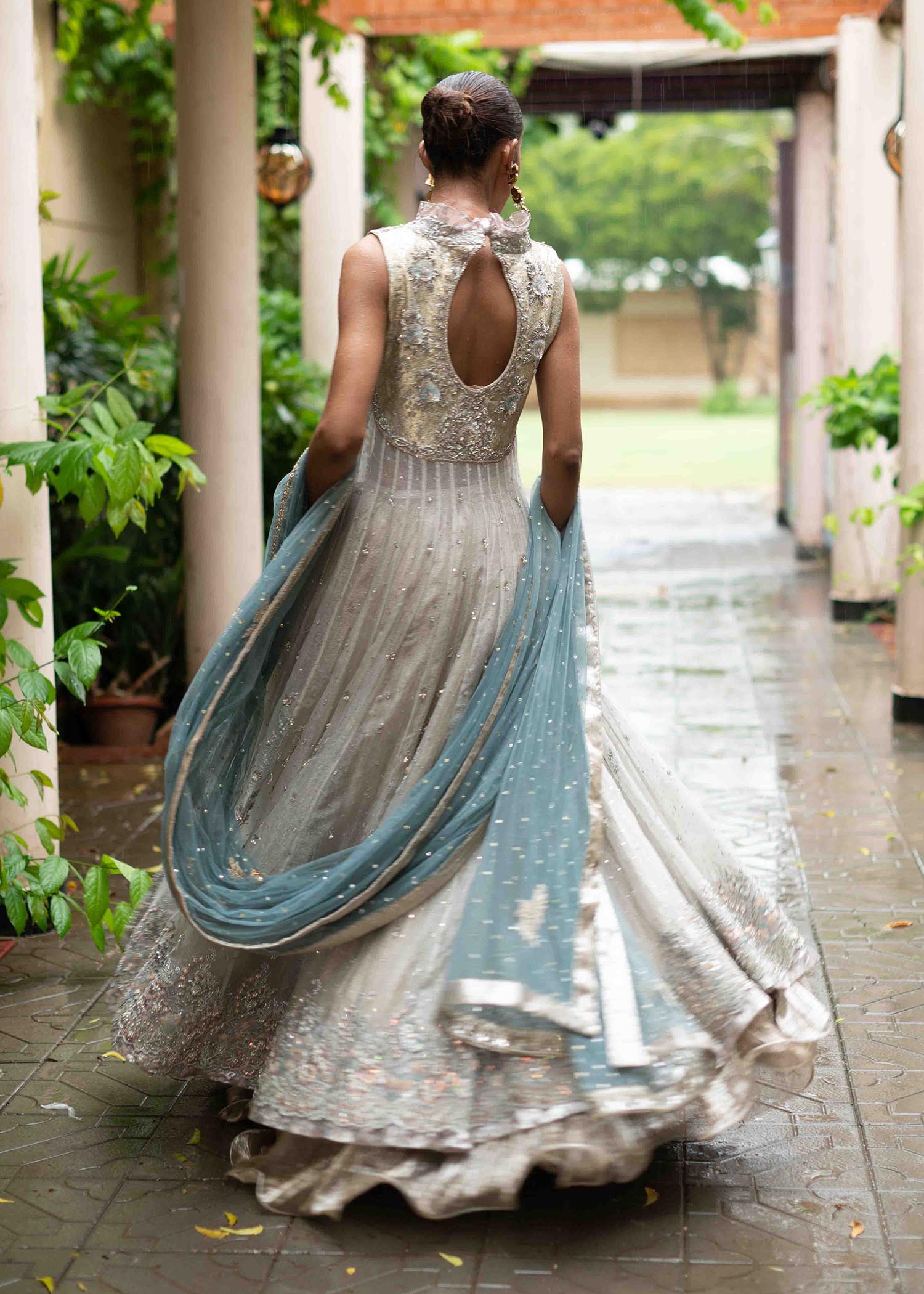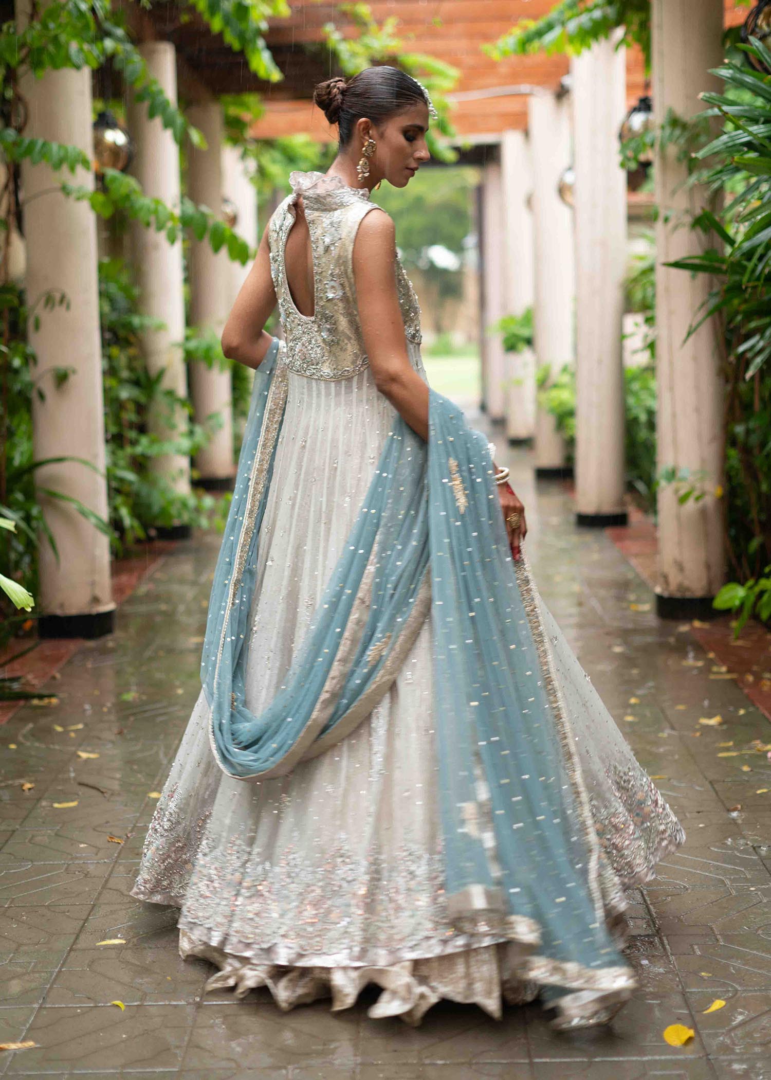 Snowball formal ensemble is artistically designed for the woman who loves to flourish her style game & embrace her individuality. This Icey gray gown, made with heavy embellishments like patch work techniques, crystals zardozi Tilla dabka 3D patterns, beautifully paired with crushed lehnga in tissue Mysore and tiffany blue Dupatta.