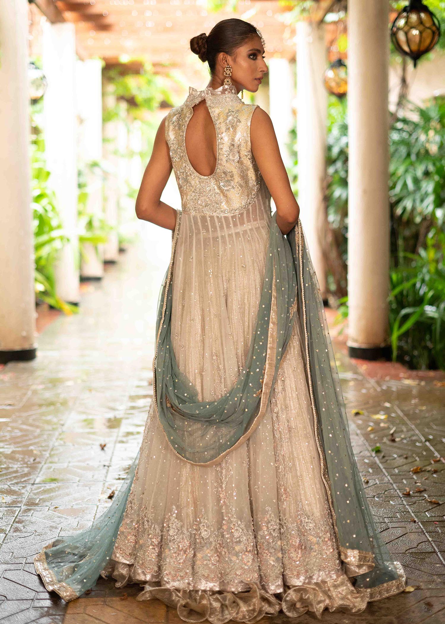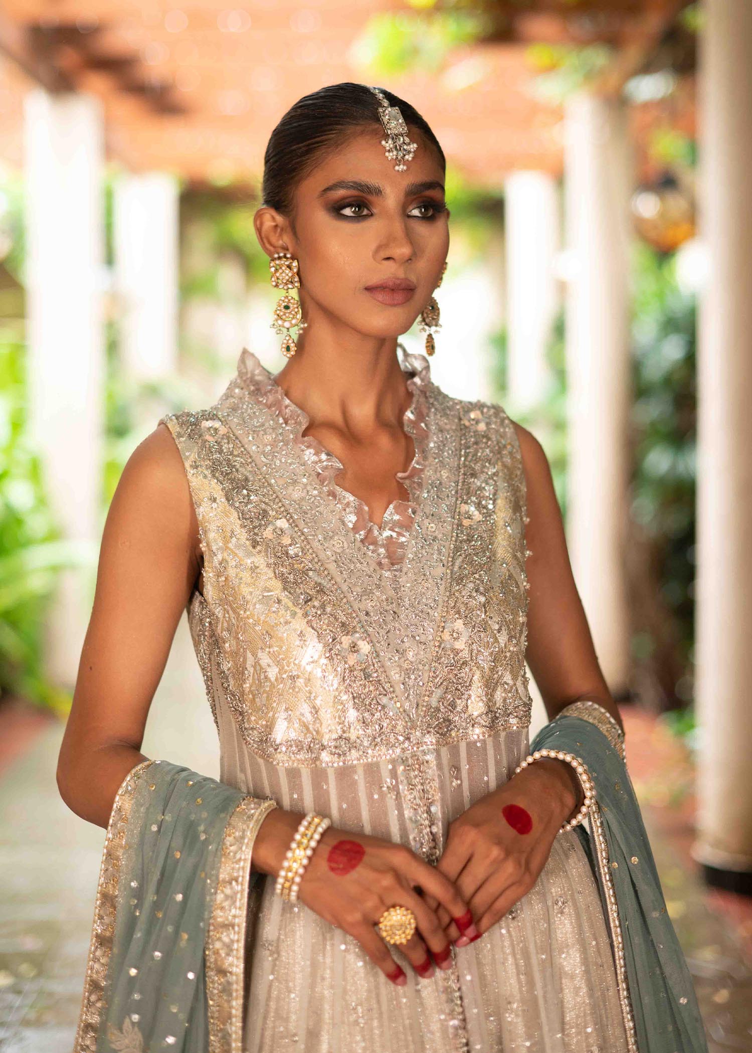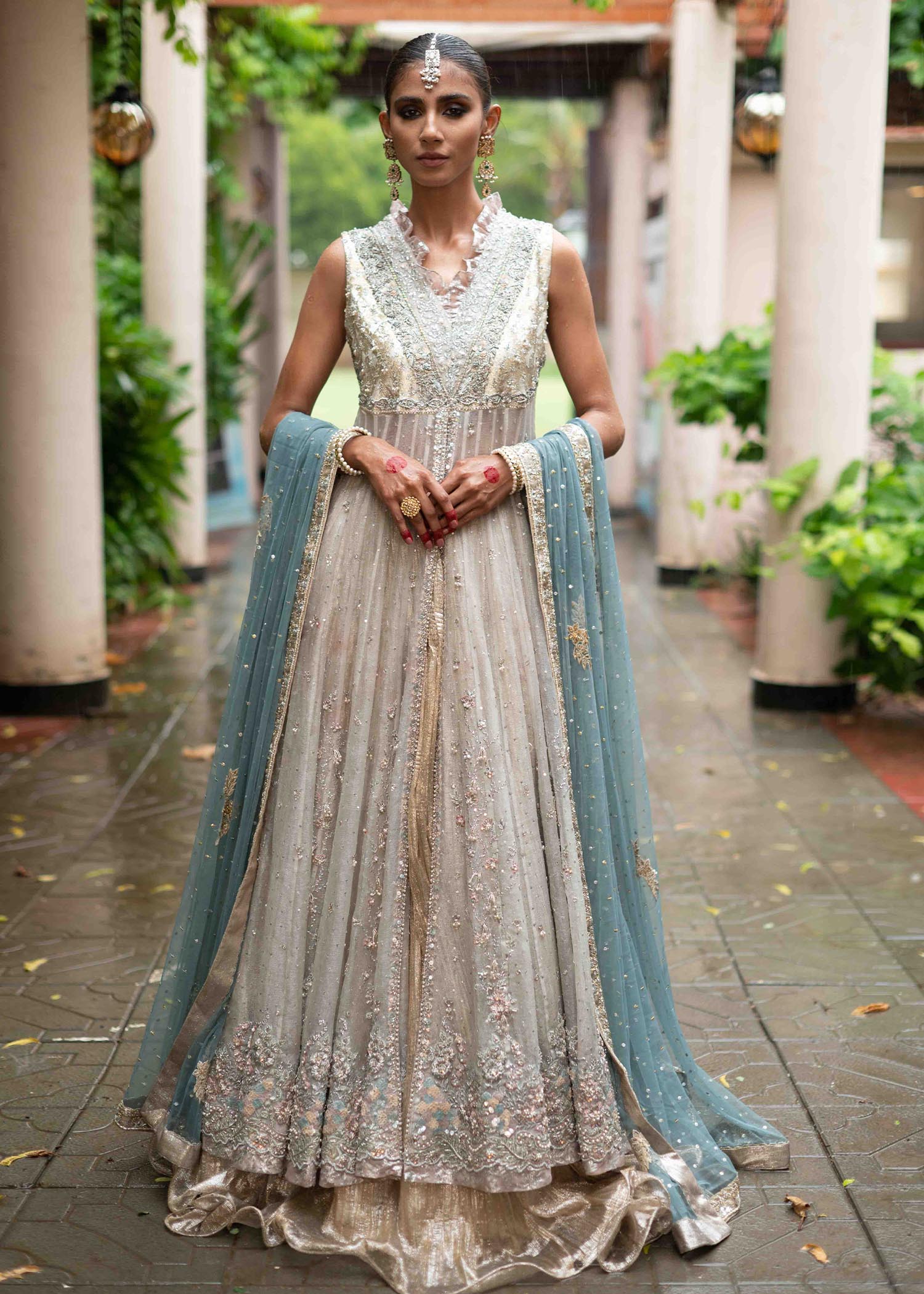 Snowball formal ensemble is artistically designed for the woman who loves to flourish her style game & embrace her individuality. This Icey gray gown, made with heavy embellishments like patch work techniques, crystals zardozi Tilla dabka 3D patterns, beautifully paired with crushed lehnga in tissue Mysore and tiffany blue Dupatta.