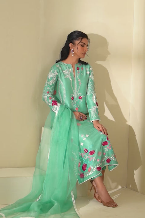 Radiate grace in this firozi green outfit that features striking embroidery with botanical details and appliques in gorgeous colors. The outfit is made in luxurious raw silk and completed with straight pants and a matching dupatta.