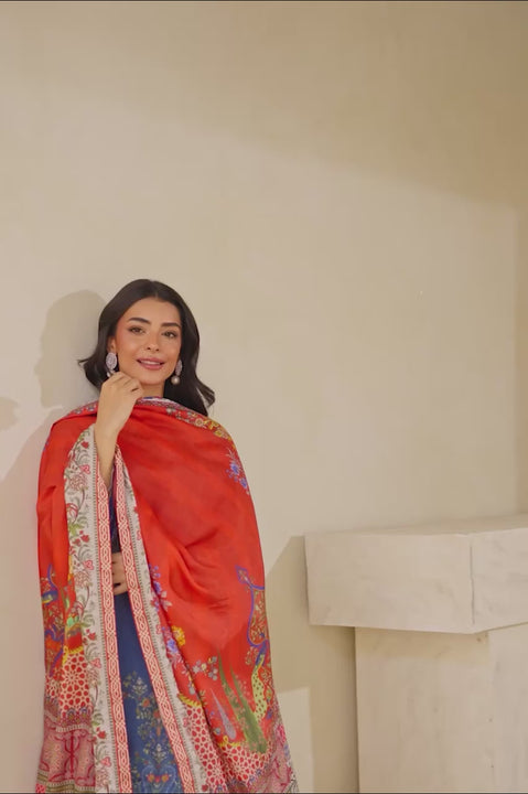 Command attention with this striking three-piece ensemble, featuring a short dark blue kora digital knee-length shirt, enriched with exquisite appliqué thread work on the neckline and sleeves. The shirt is adorned with artistic digital prints that continue seamlessly onto the light blue kora digital dupatta, offering a soft contrast of colors enhanced by delicate lace work throughout. Paired with beautifully embroidered khaddi cotton farshi shalwar, this look merges traditional craftsmanship with contemporary elegance—perfect for festive events or cultural occasions that call for timeless sophistication.