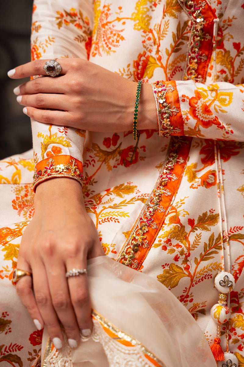 Ivory and burnt orange tones of floral print on a beautifully cut angrakha. Embroidery and hand work defines the cut and sleeves hem. Gota laces on daaman brings out the...