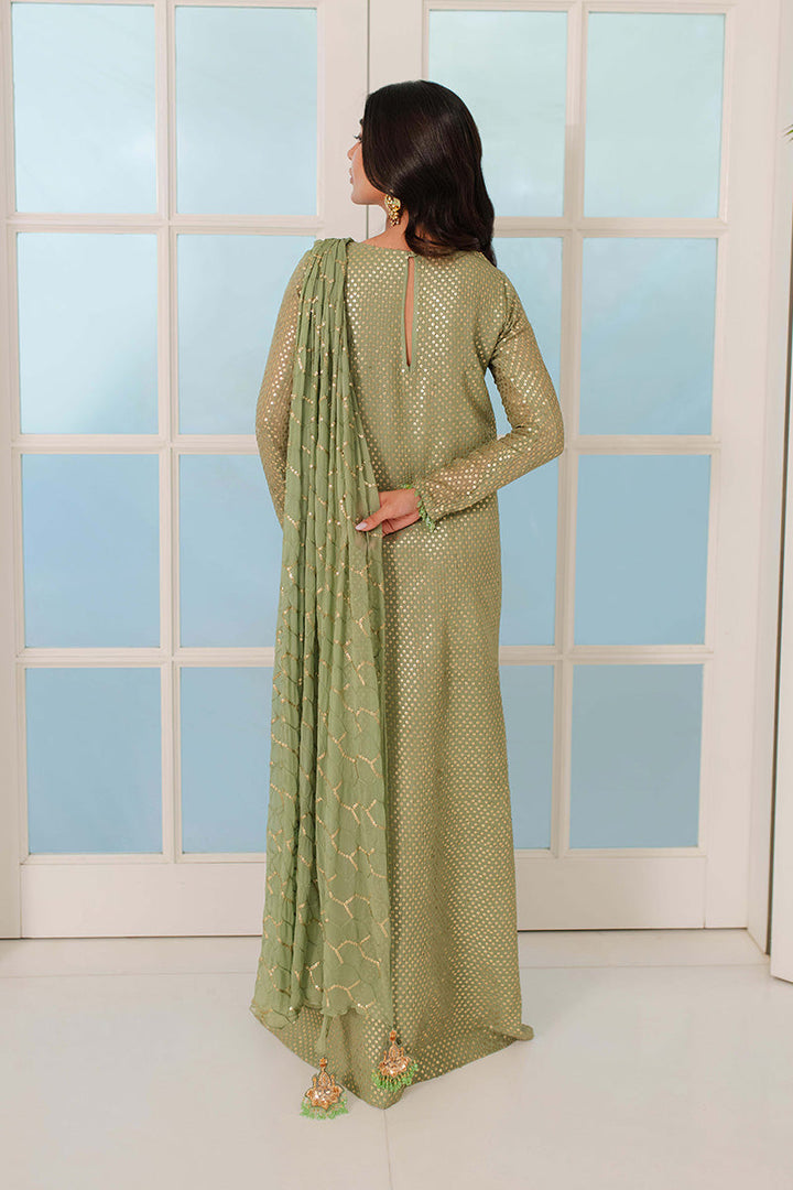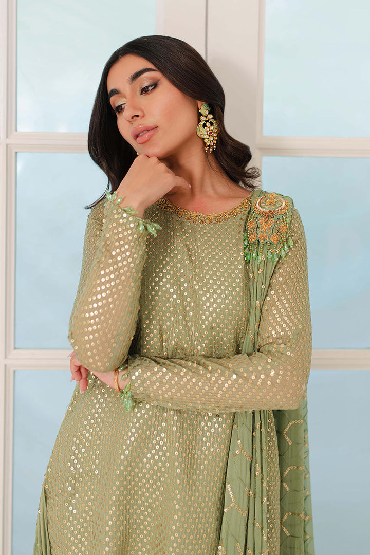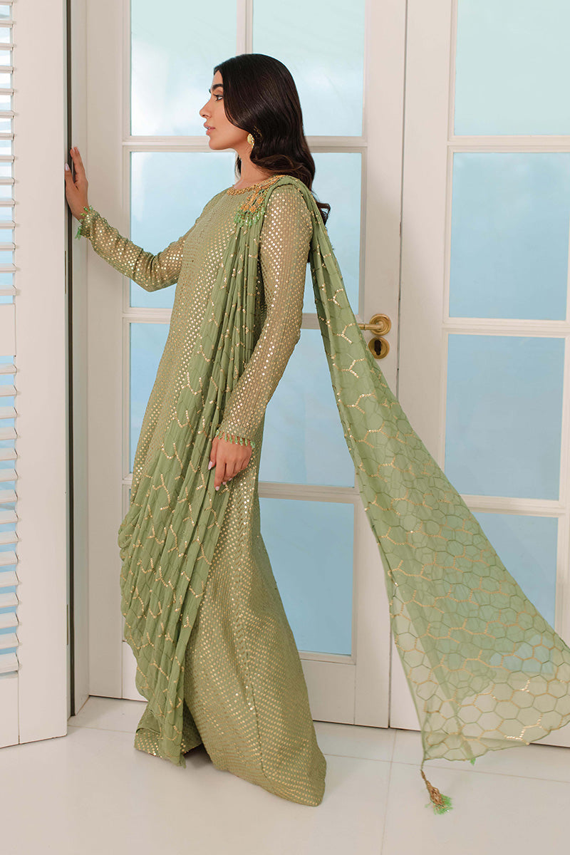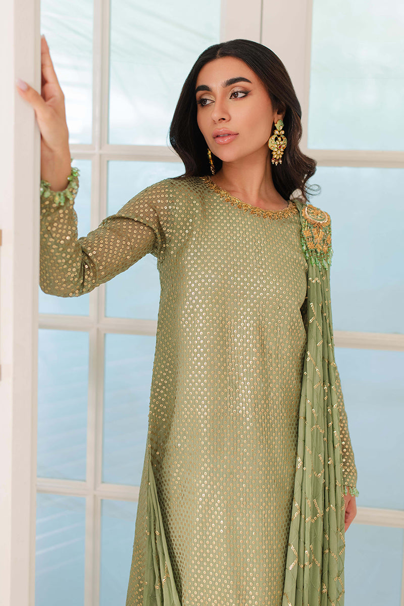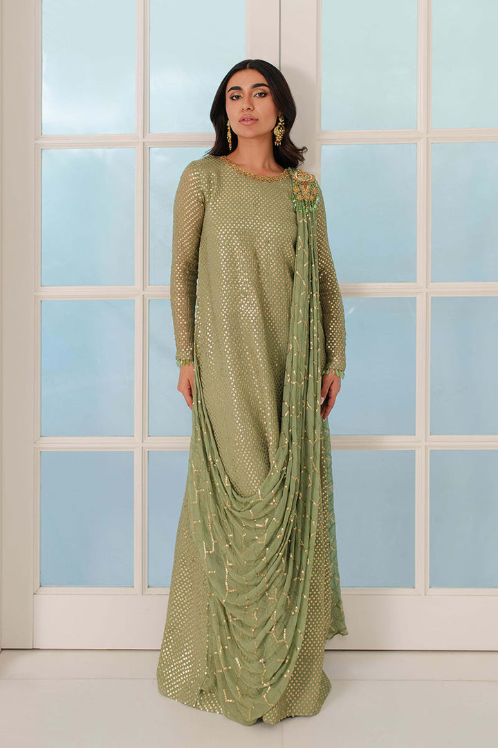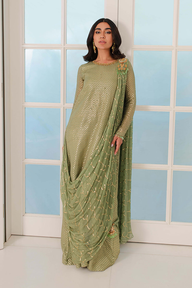 Be a vision in Mina Hasan's signature deconstructed saree. This sage green outfit features a delicate floral neckline and a hand embellishment tassel on the gathered pleating. The outfit features crystal breading on the sleeves and gold sequins adorning the bodice of the outfit.