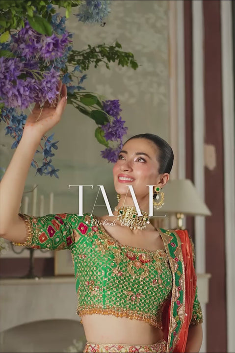 Step into timeless elegance with this pure raw silk blouse in a deep, regal green, brought to life through intricate hand embroidery blending floral and geometric motifs. Delicately crafted tassels cascade along the bodice, adding graceful movement, while statement tassels at the back lend a playful yet sophisticated charm. The blouse is paired with a charmeuse silk lehenga, featuring a vibrant medley of colors and artistic patterns that swirl across the fabric like brushstrokes. A meticulously finished border outlines the hem, adding a refined structure to the fluid silhouette. Completing the ensemble is a zari organza dupatta, designed in a bold contrast of orange and green. It glows with delicate sequin work scattered throughout, and a beautifully finished border that adds definition and sparkle—perfectly tying together tradition and contemporary flair.