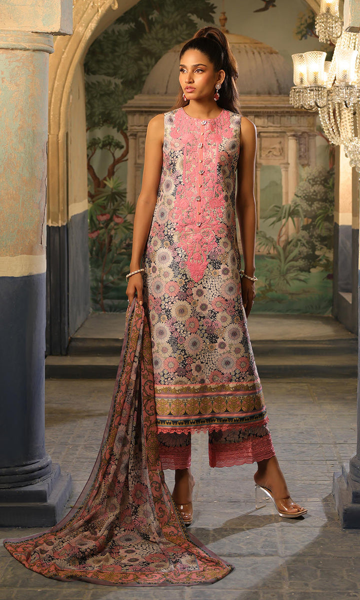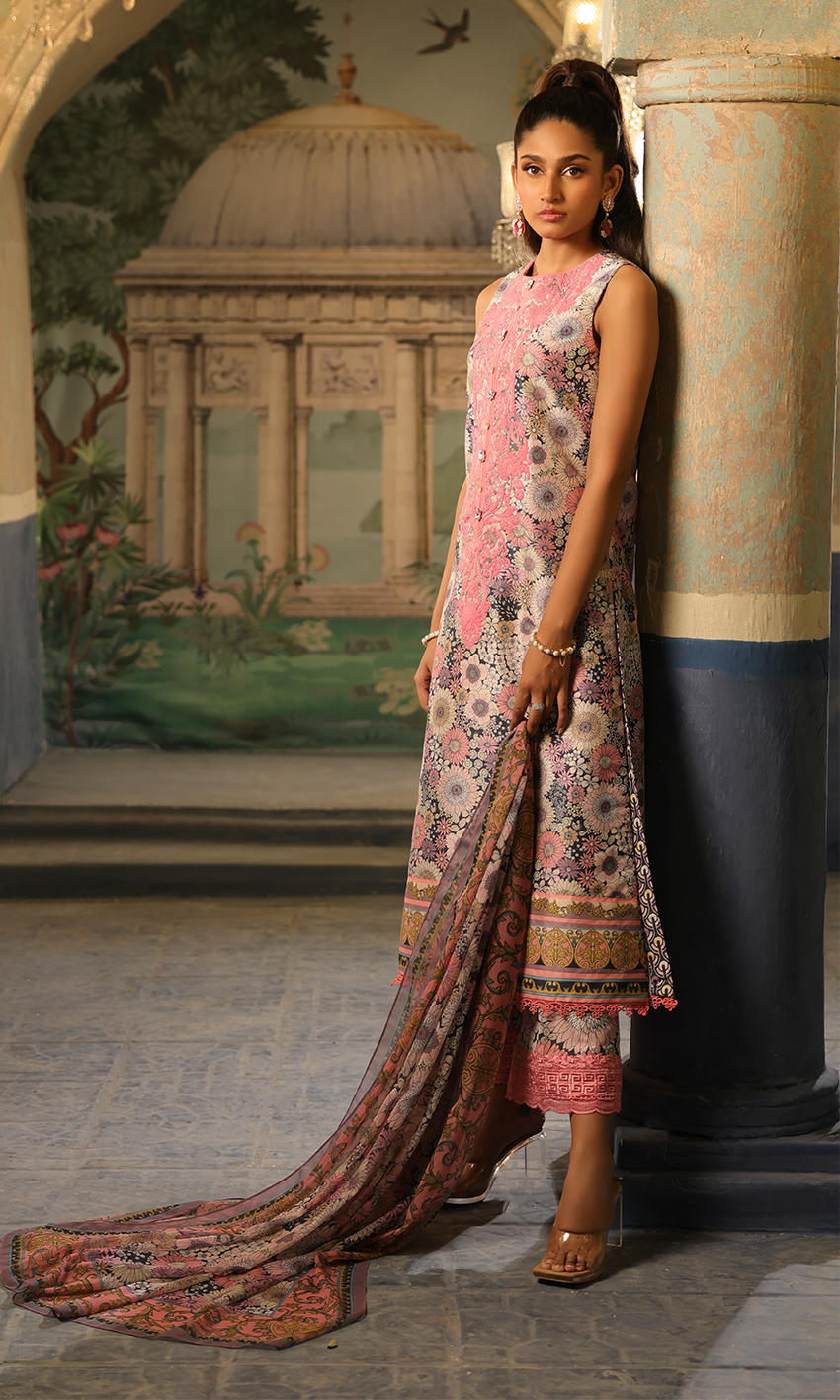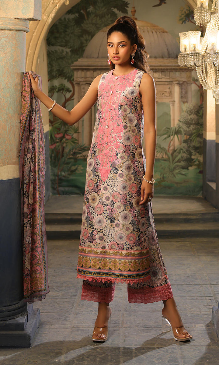 Raw silk shirt adorned with a heavily embroidered neckline, paired flawlessly with printed raw silk pants featuring an embroidered border and a matching printed dupatta.