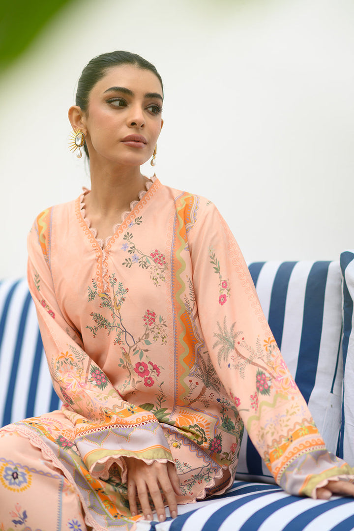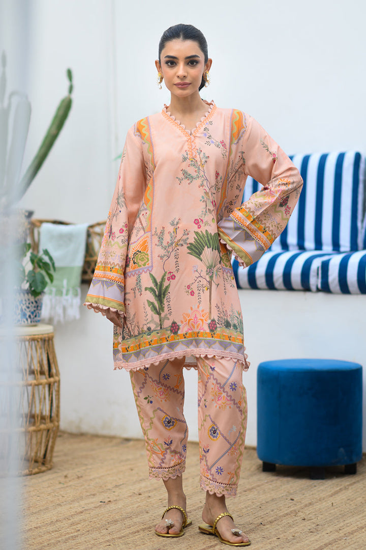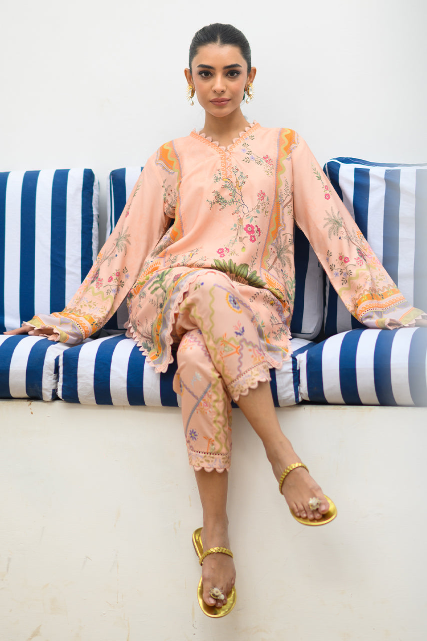 A playful co-ord set featuring a short, relaxed fit kurta and tapered shalwar is rendered with a nature inspired print.