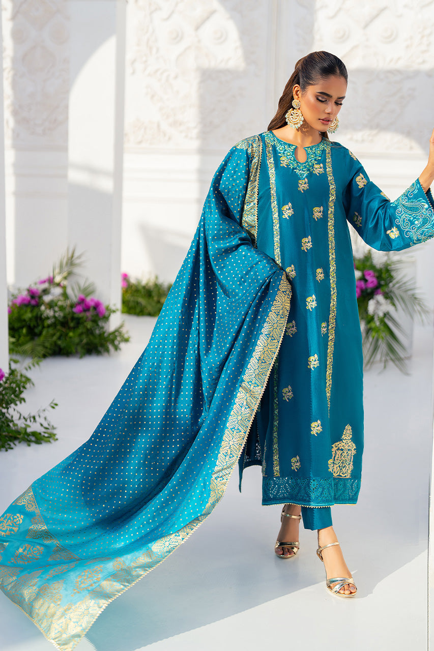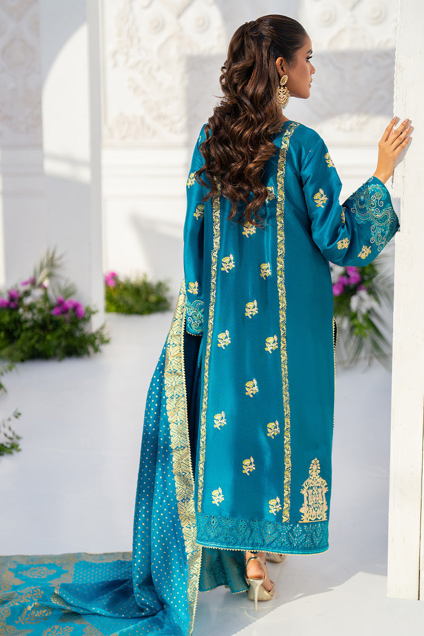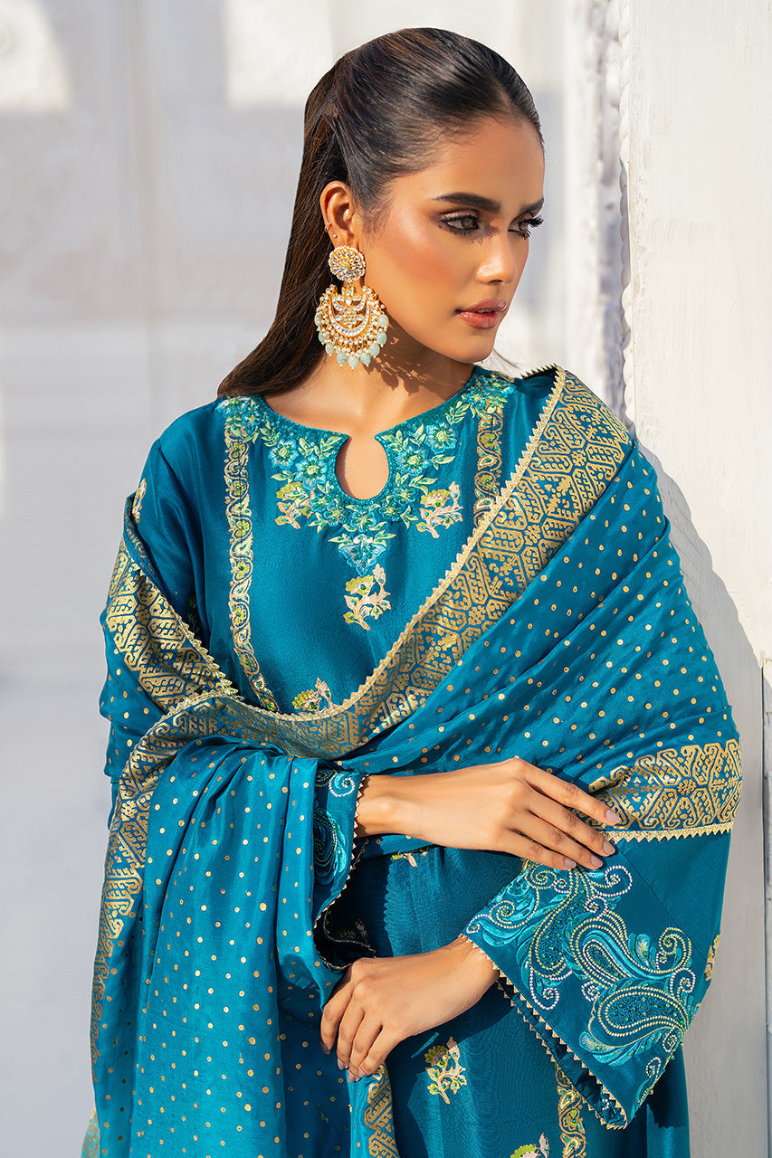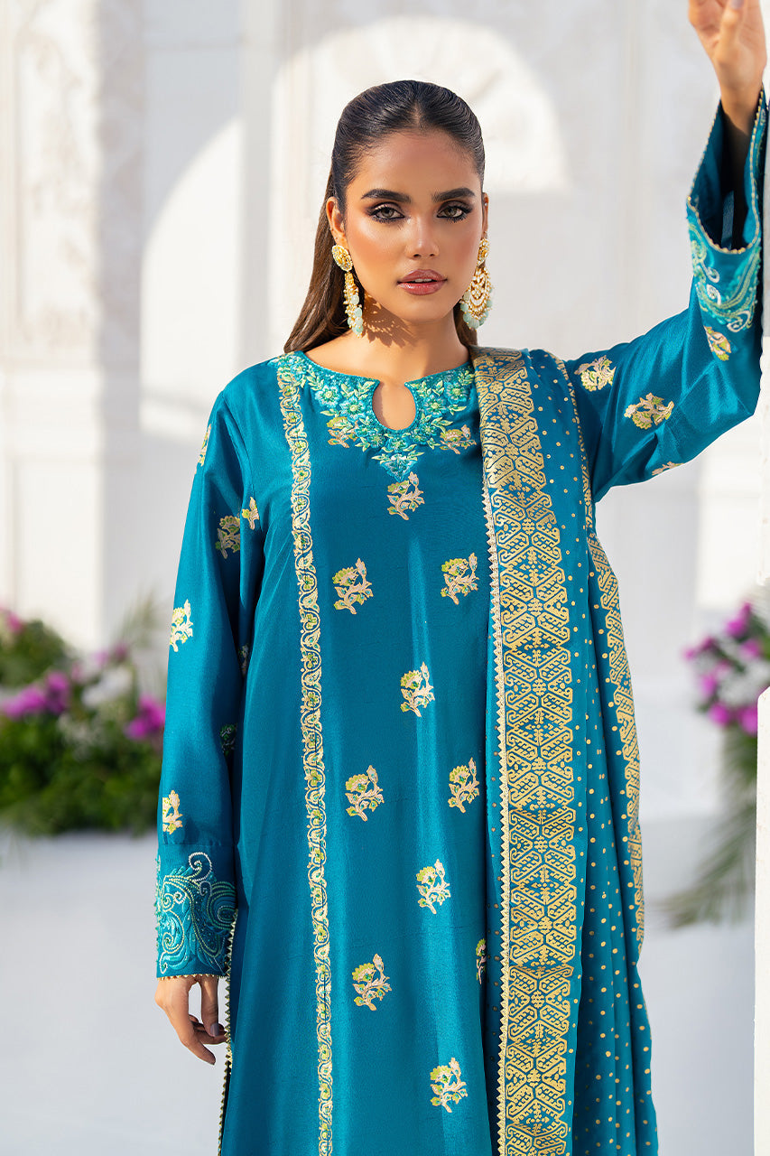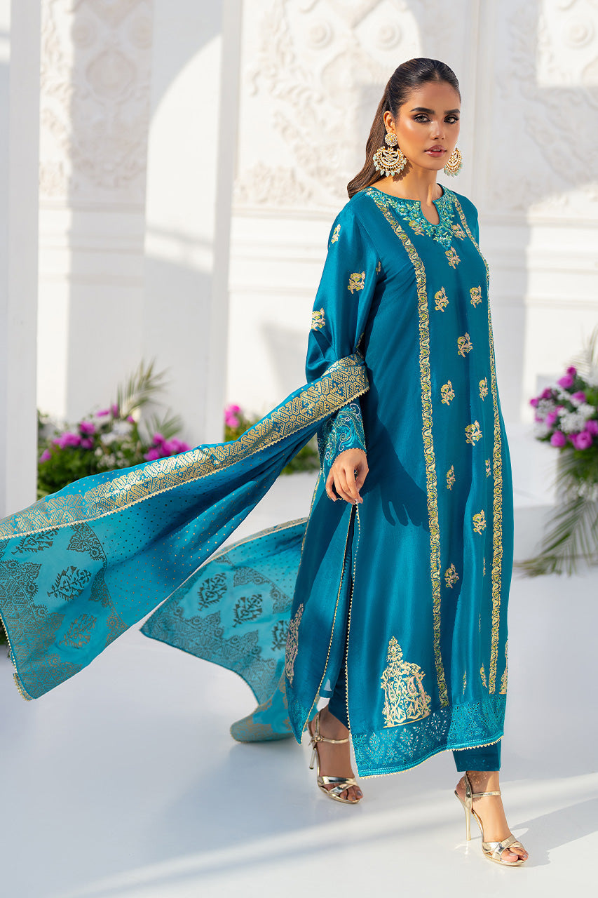 Tip into luxury with our exquisite A-line raw silk shirt, adorned with captivating block prints and hand embroidery on booties, embellished with pearls and sequins for a touch of glamour. on the neckline adds a charming detail. Paired with schfili border on the daman and sleeves, it exudes elegance from every angle. Complete the look with ezar and a block printed medium silk dupatta, creating a perfect harmony of style.