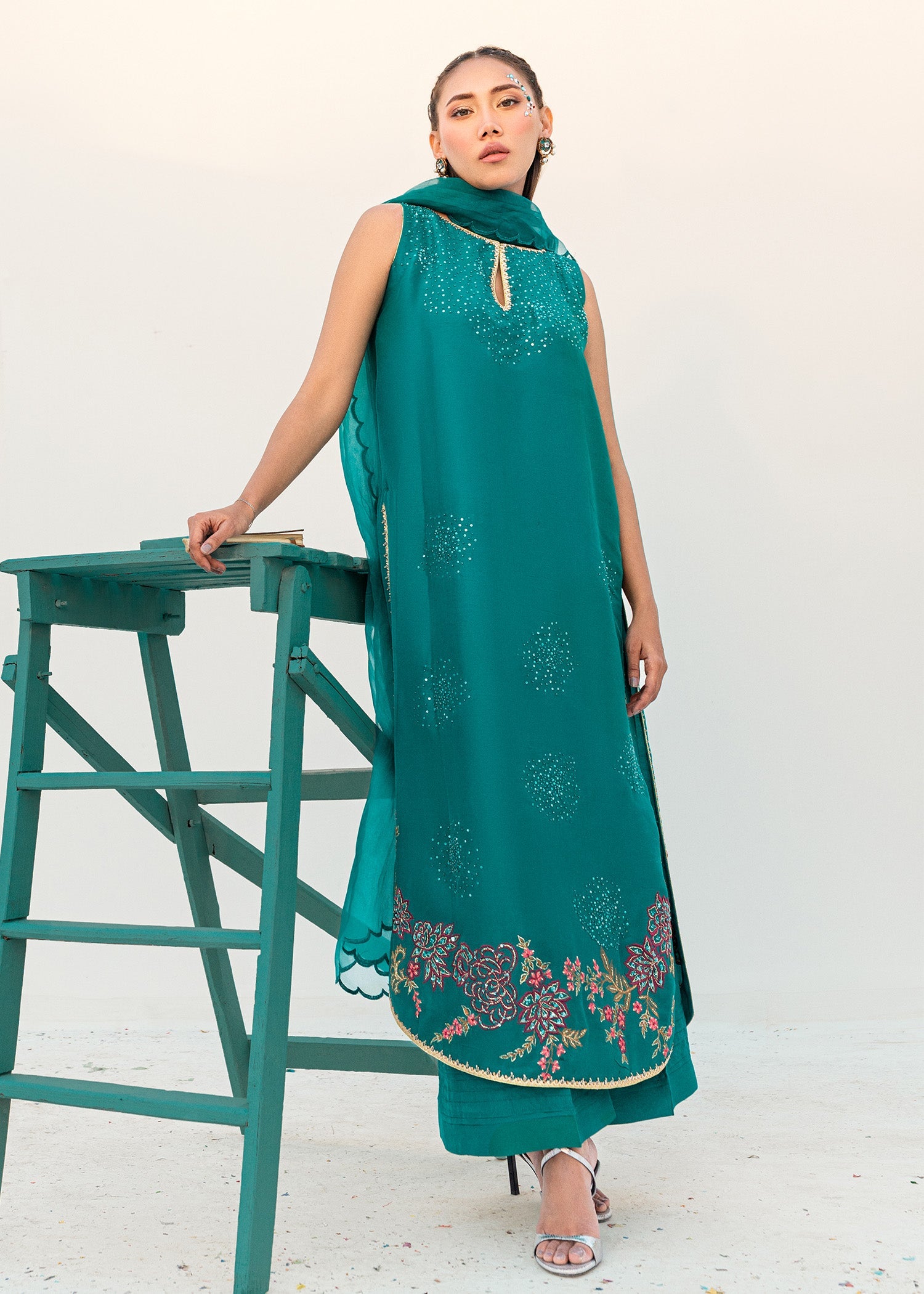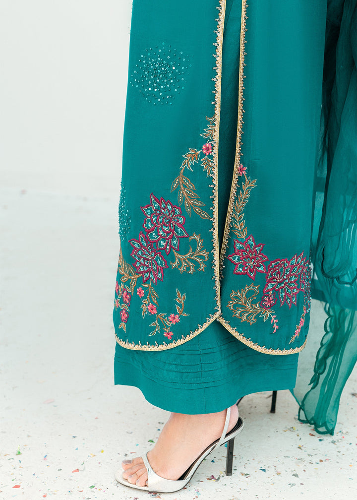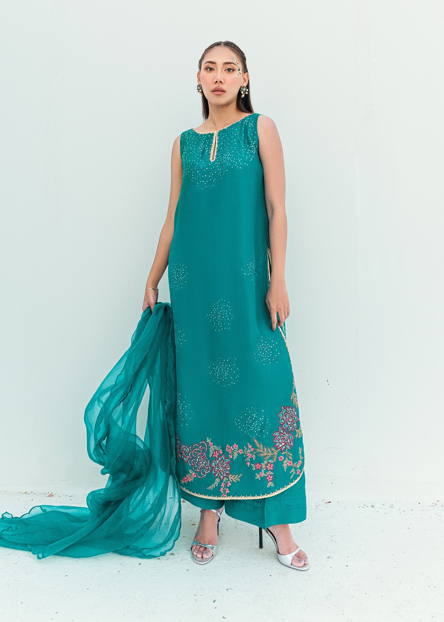 This is a straight shirt with a slightly rounded hem, featuring embroidery details along the hem and a neckline adorned with sequins, handwork, and gota embellishments. It is paired with classic culottes and an organza dupatta, finished with lace and scalloped edges.