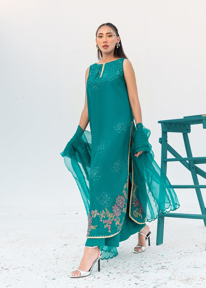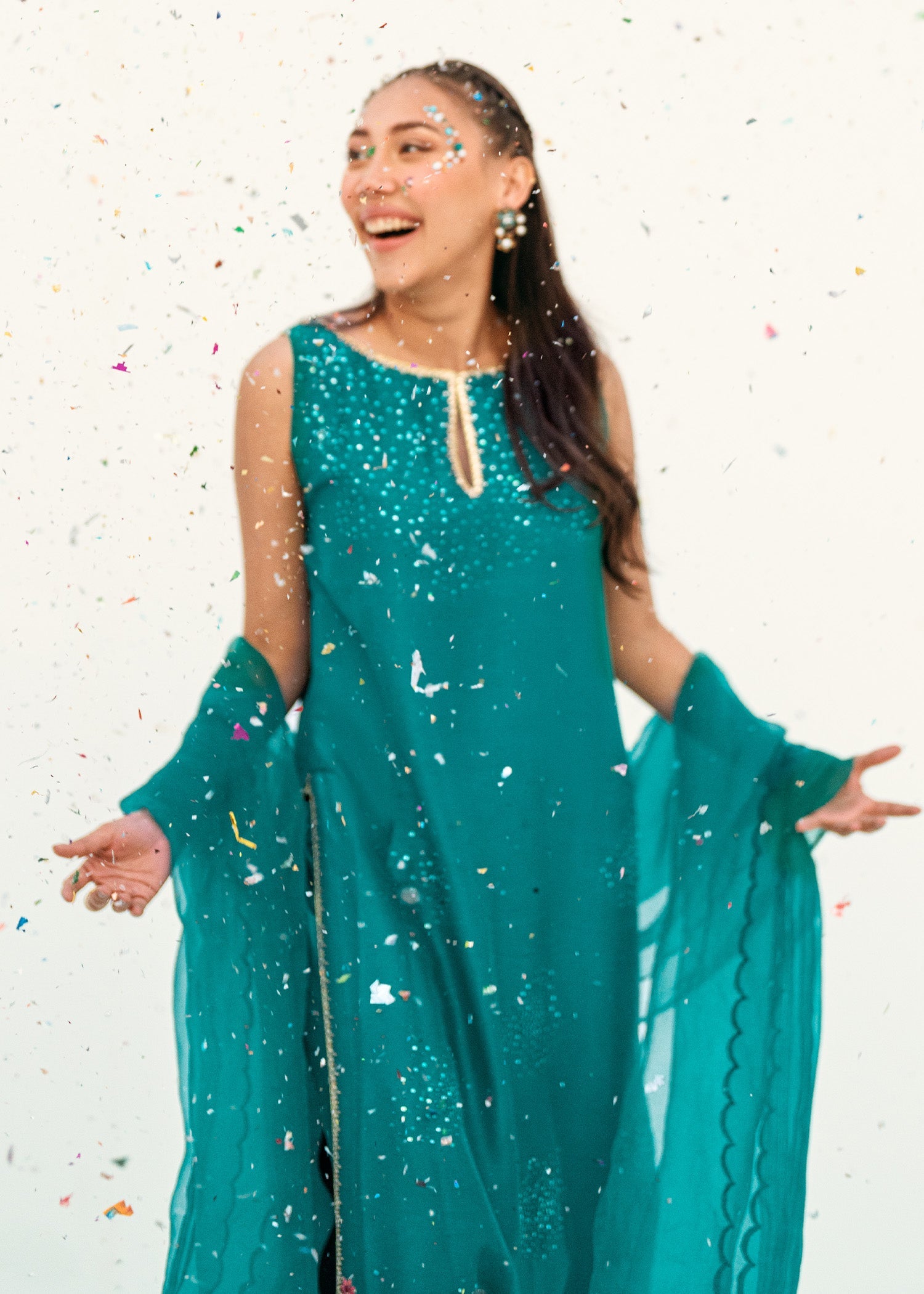 This is a straight shirt with a slightly rounded hem, featuring embroidery details along the hem and a neckline adorned with sequins, handwork, and gota embellishments. It is paired with...