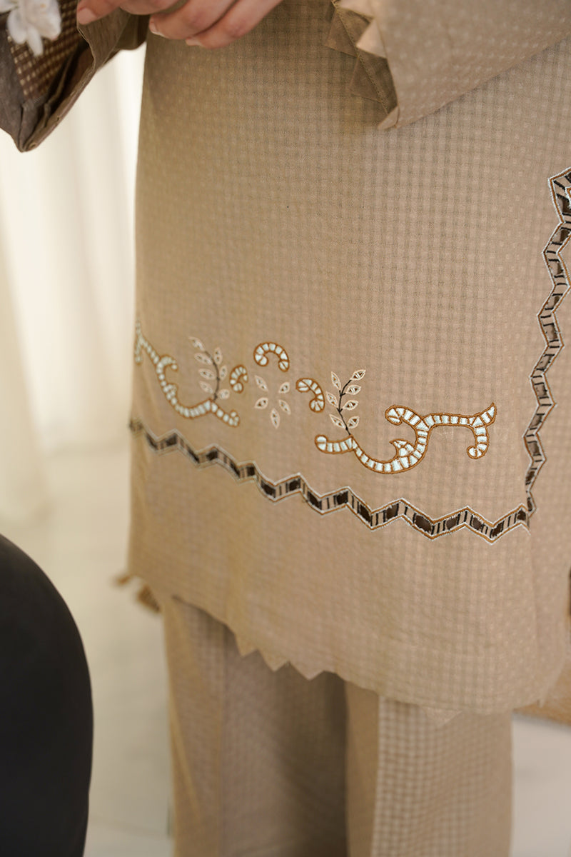 Sugar almond ensemble is designed on a chequered canvas in beige. This two-piece set comprises of a short shirt with cutwork on hemline. The shirt is adorned with resham work, machine stitches and fabric manipulation on neck, hemline and sleeves. Pair our sugar almond shirt with culottes, completed with detailing to enhance the overall look.
