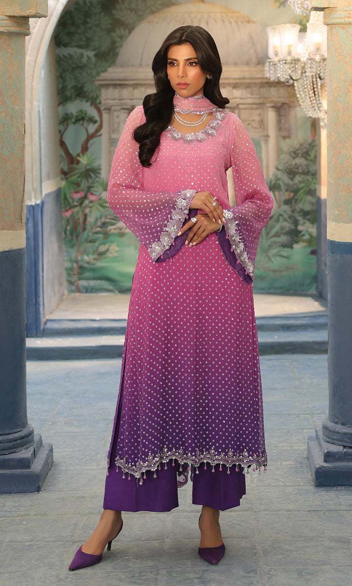 This ombre chiffon ensemble features signature sequin base with embellished neckline, sleeves and hem. It is paired with a sequins scalloped chiffon dupatta and raw silk pants.