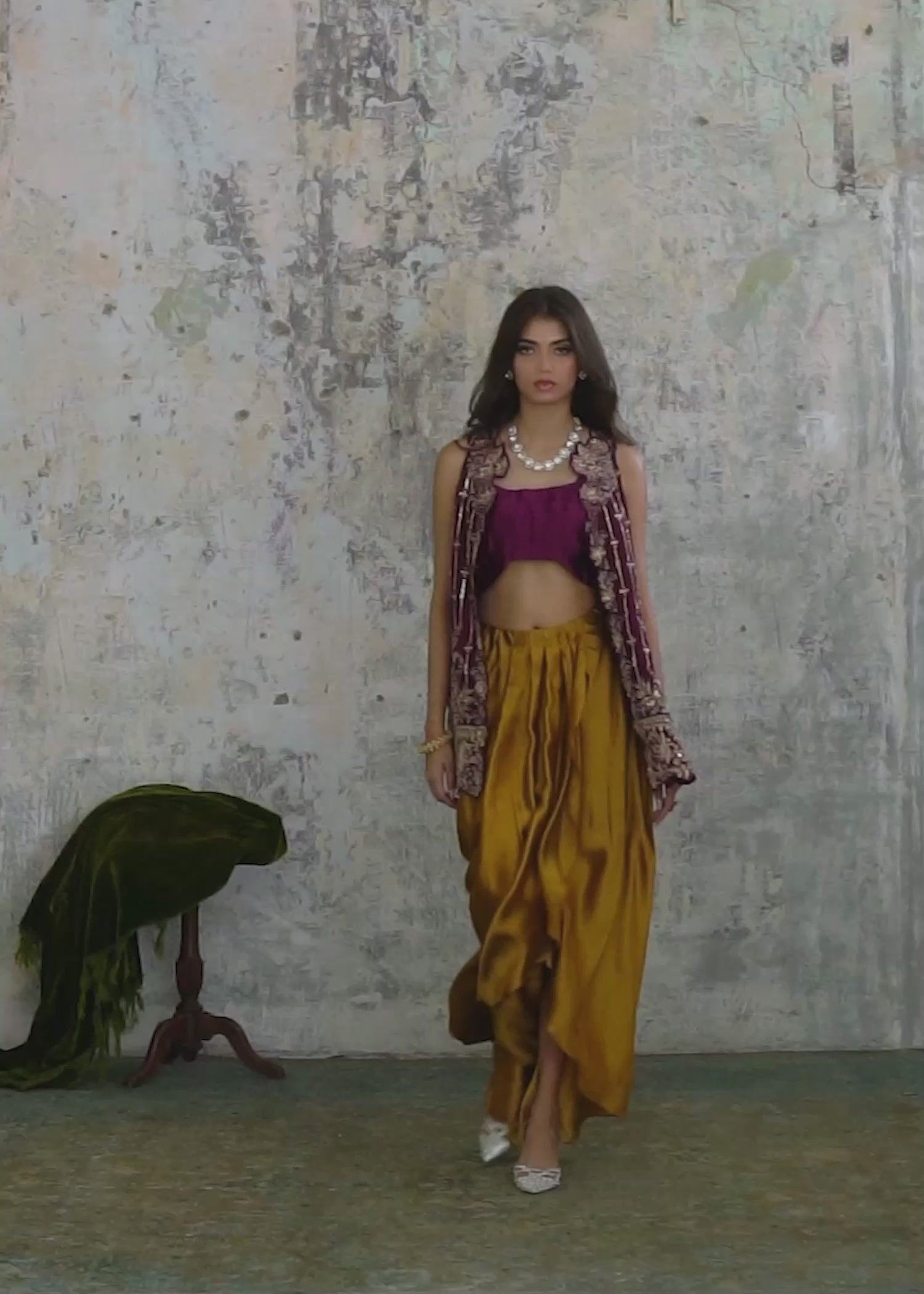 This striking dress features a mustard skirt with a contemporary cutline that adds a fresh, modern edge. The plum bustier is expertly tailored for a flattering fit, while the sleeveless short jacket in rich plum caspia, adorned with exquisite hand-embroidered details. Together, these elements create a sophisticated and elegant ensemble, perfect for making a statement at any special occasion.