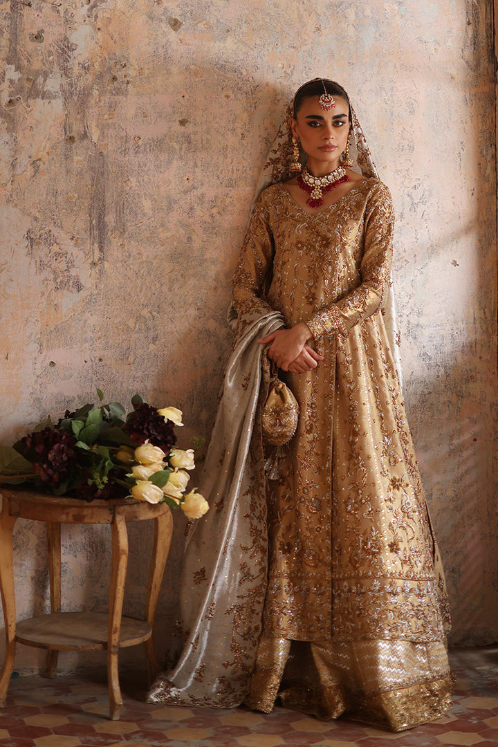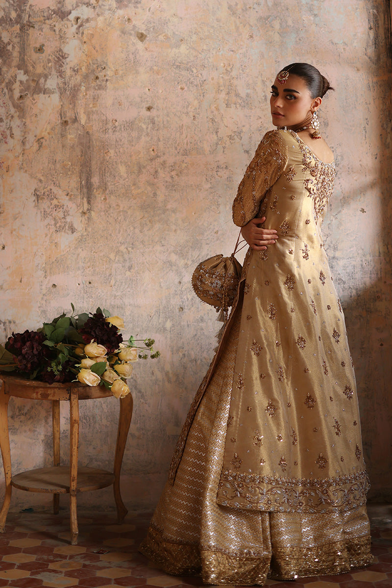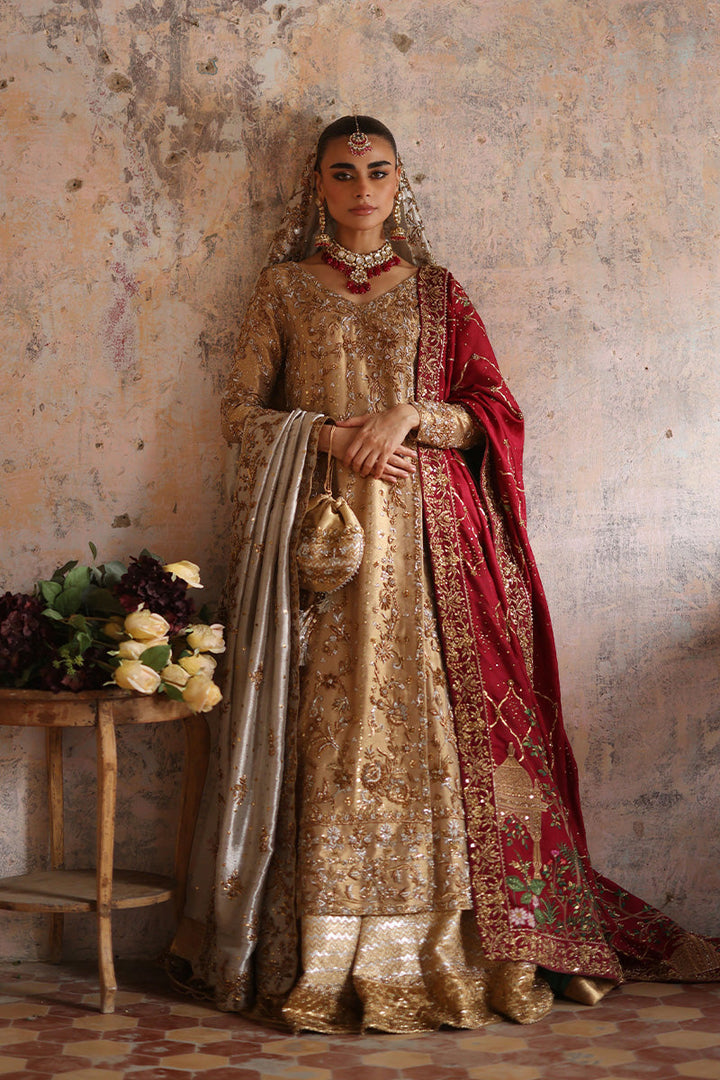 Look beyond ravishing in this gold outfit! Featuring delicate gold floral kaam throughout the bodice, the outfit is anchored by a heavy floral border with layered gold kaam. The outfit features a a jamawar pishwaas with gold kaam, a stunning dupatta with floral embellishments on the border in a constrasting color and gold pouch. Maroon chaddar to be sold separately