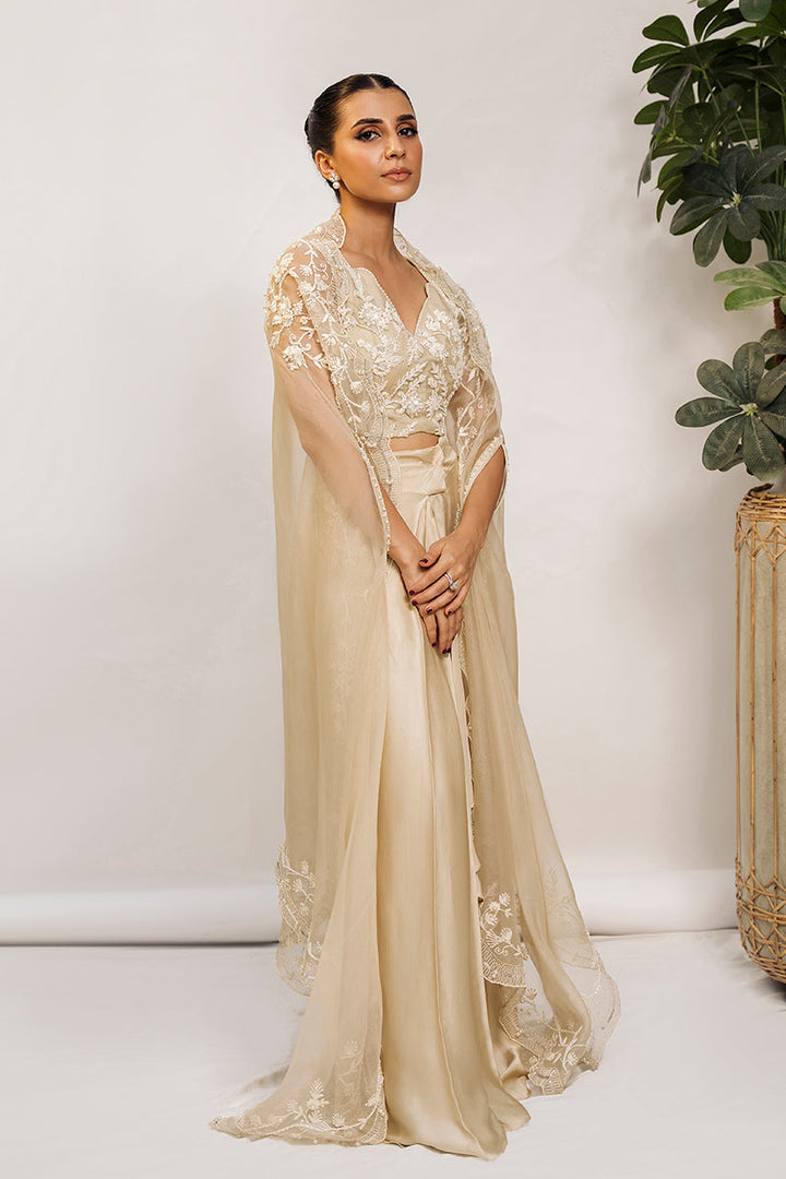 we are in love with this vanilla shade. Understated yet fully worked ( thread-work, sequence, Cutdana) organza cape jacket. Scalloped neckline choli catches the attention with its intricate worked anchor...