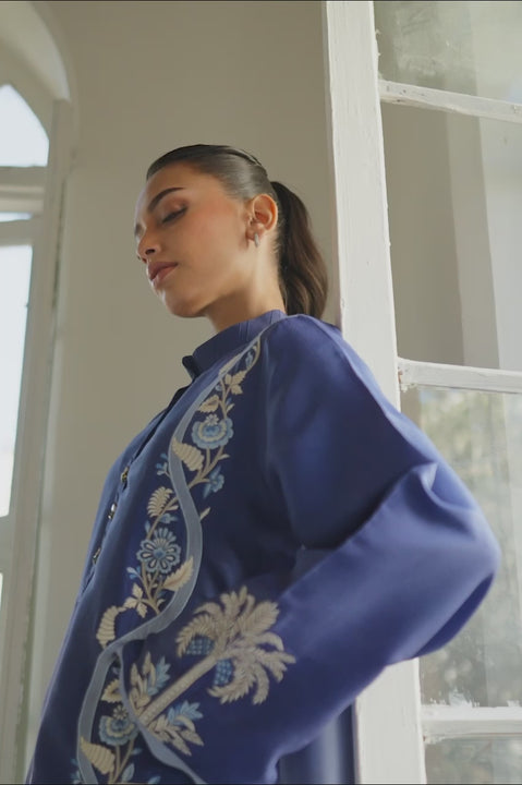 A fluid tunic enveloped in a deep sapphire hue is adorned with intricate gilded embroidery in a cascading floral motif. Crafted from pure rawsilk, the top is framed with scalloped...