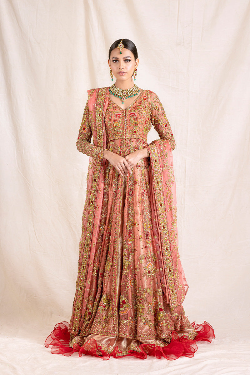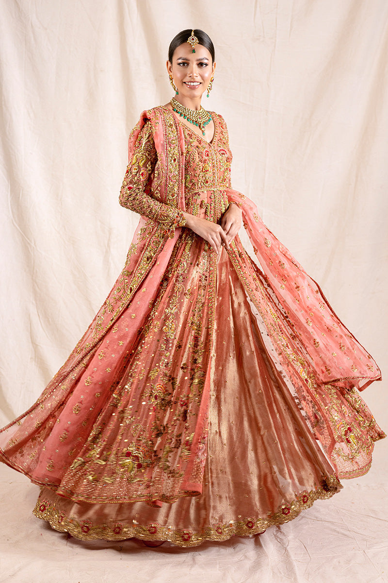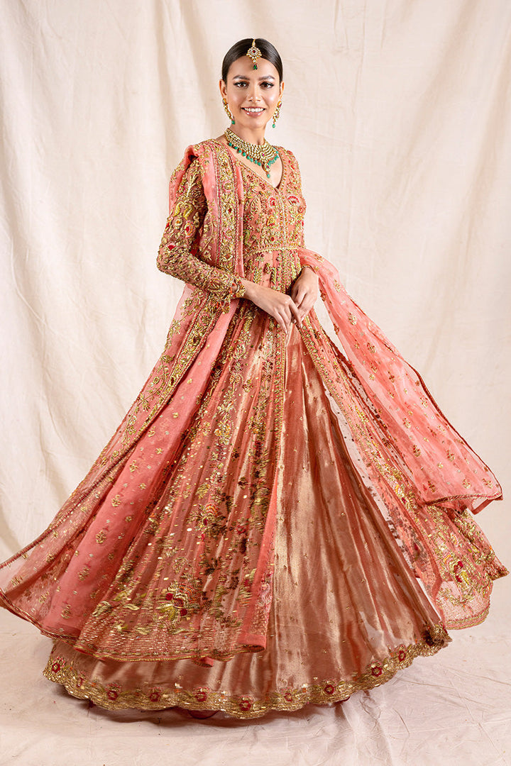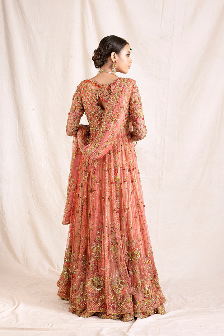 Look like an absolutely beauty in this stunning peach pishwas. The outfit features delicate zardozikaam, gota kaam and hand embroidered floral details. The outfit is completed with a four border...