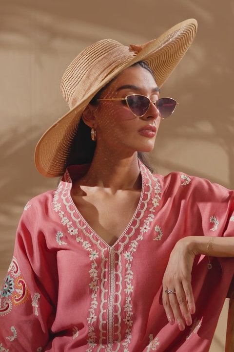 This rust kaftan shirt in pure raw silk radiates elegance and sophistication. The shirt is adorned with intricate aari embroidery around the hem and neckline, featuring delicate aari patterns with contrasting appliques that add a touch of artistry and refinement. The small slits are elegantly detailed with matching aari embroidery, enhancing the overall design with an added sense of movement and grace. This kaftan is a perfect blend of contemporary style and traditional craftsmanship, making it an ideal choice for a chic, statement look. Pants are an add on.Â