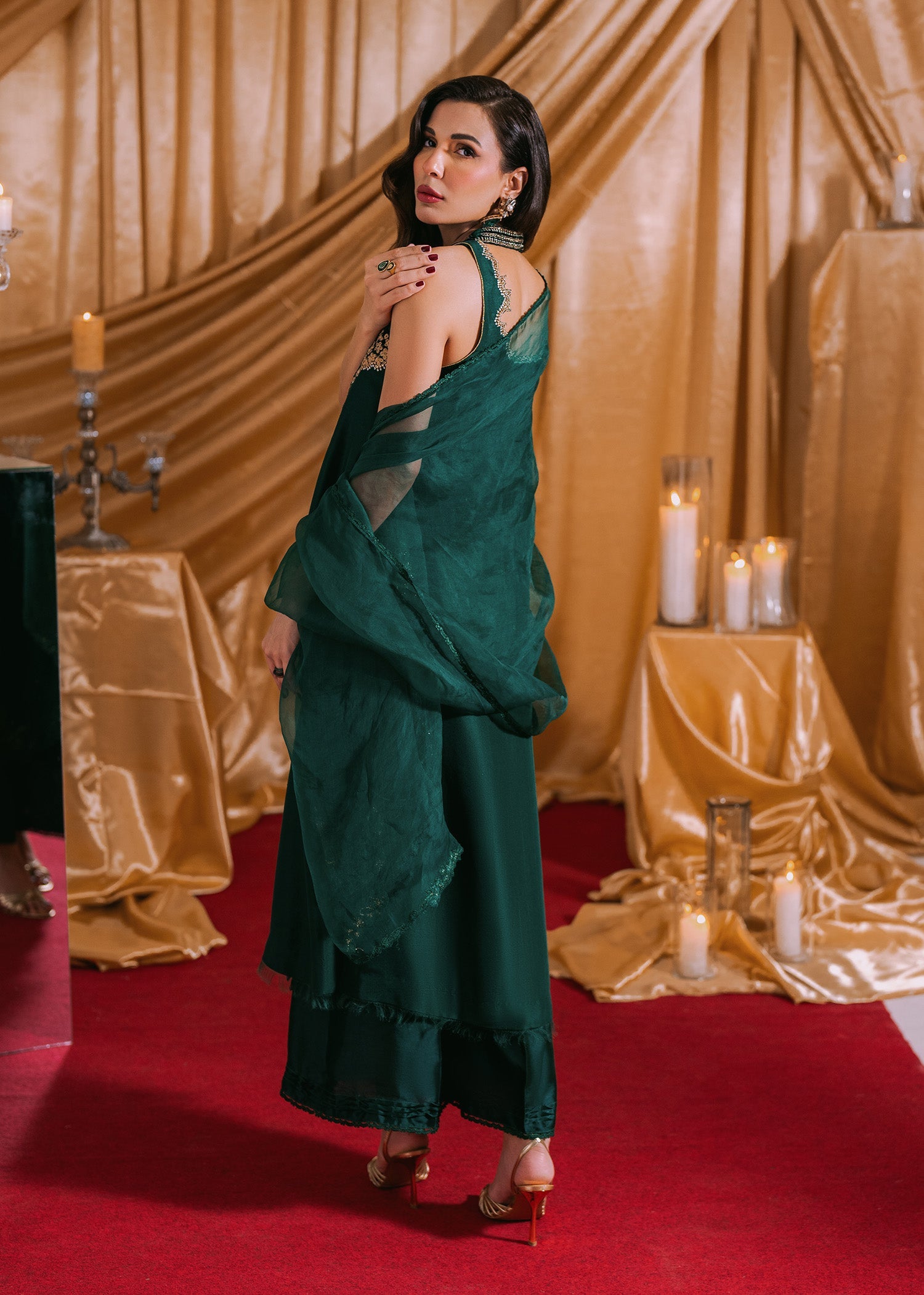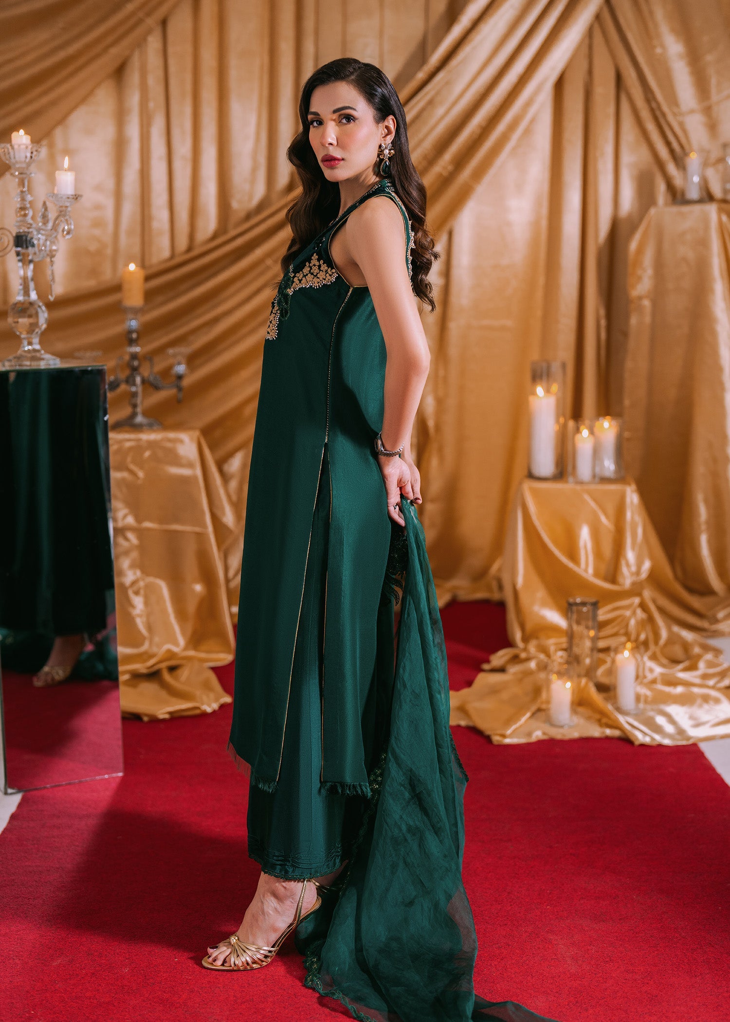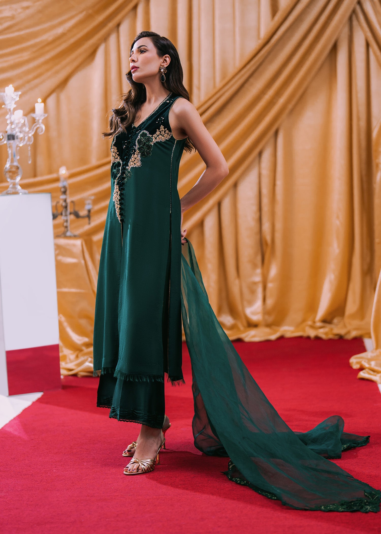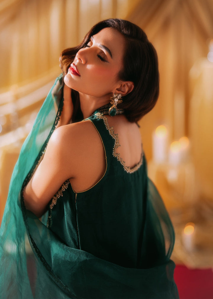 The outfit features a sophisticated raw silk shirt with velvet detailing on the neckline and velvet buttons running down the front. It is paired with a dupatta embellished with decorative...