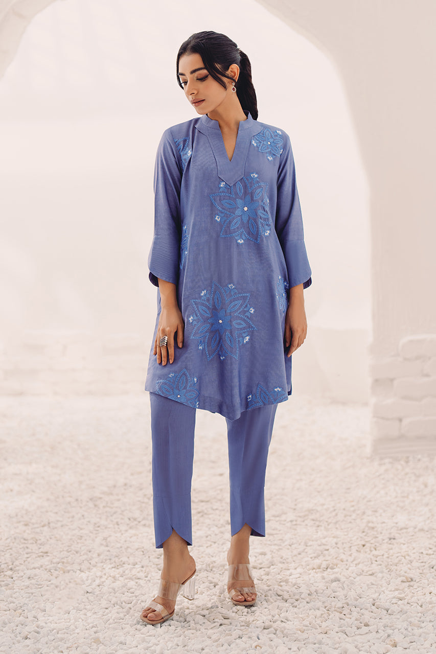 This two-piece shirt is a true statement of modern fashion. It is adorned with intricate embroidered patches on the front, offering a contemporary yet elegant look. The outfit is complemented by...