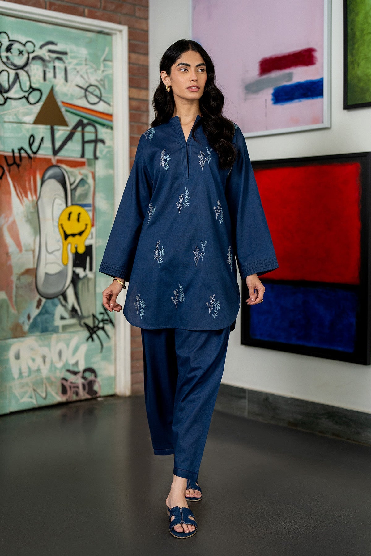 This blue co-ord set features floral embroidery on the front, neckline with pintex details, and paired with a tapered shalwar.