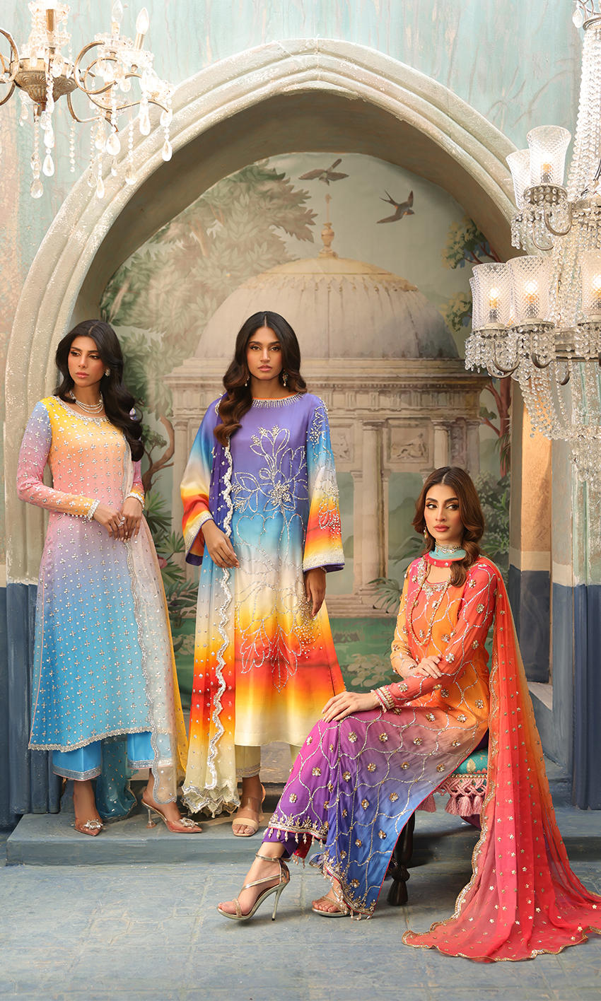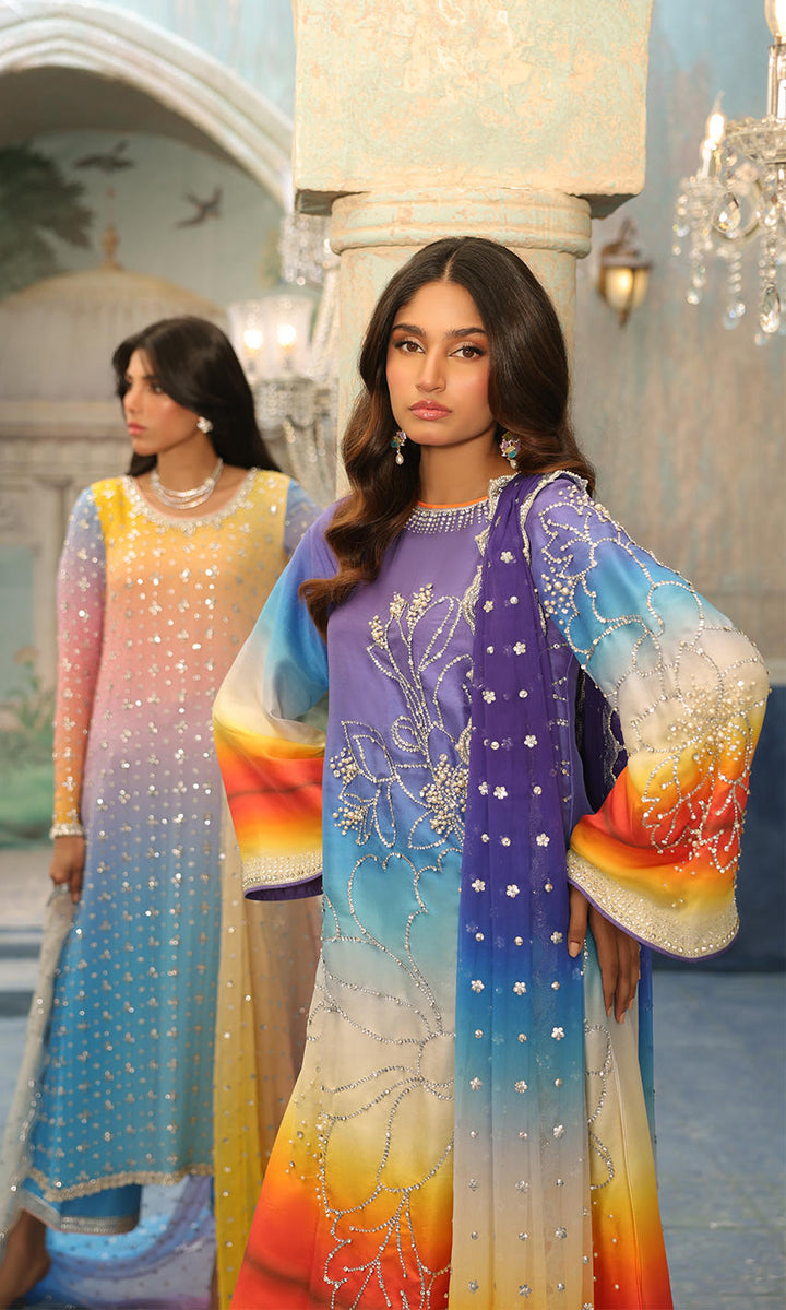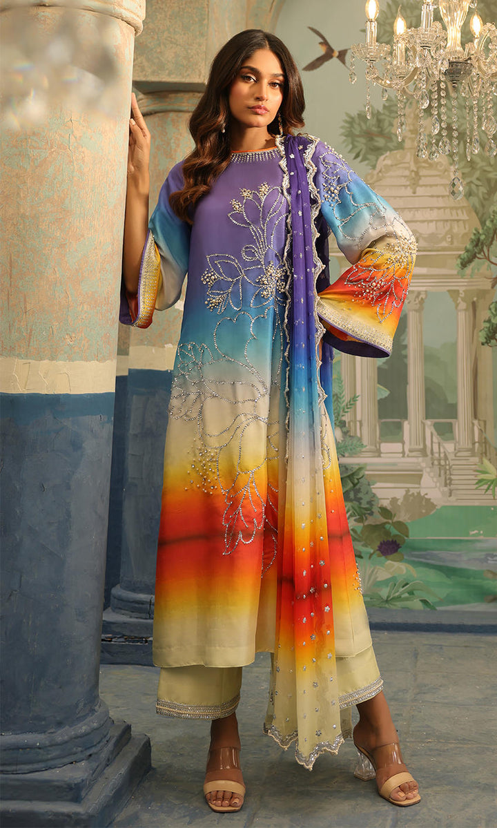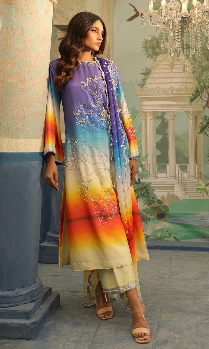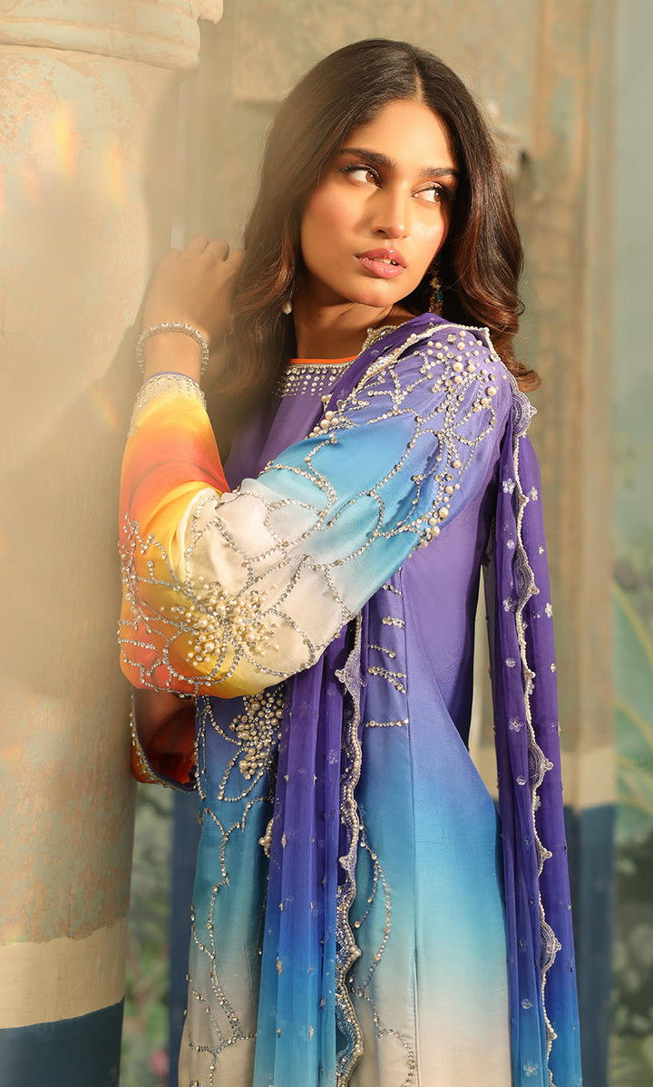 Shaded with asymettric pearl and crystal floral patterns, and a matching worked dupatta to complete the look.