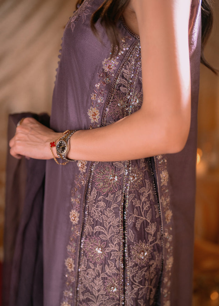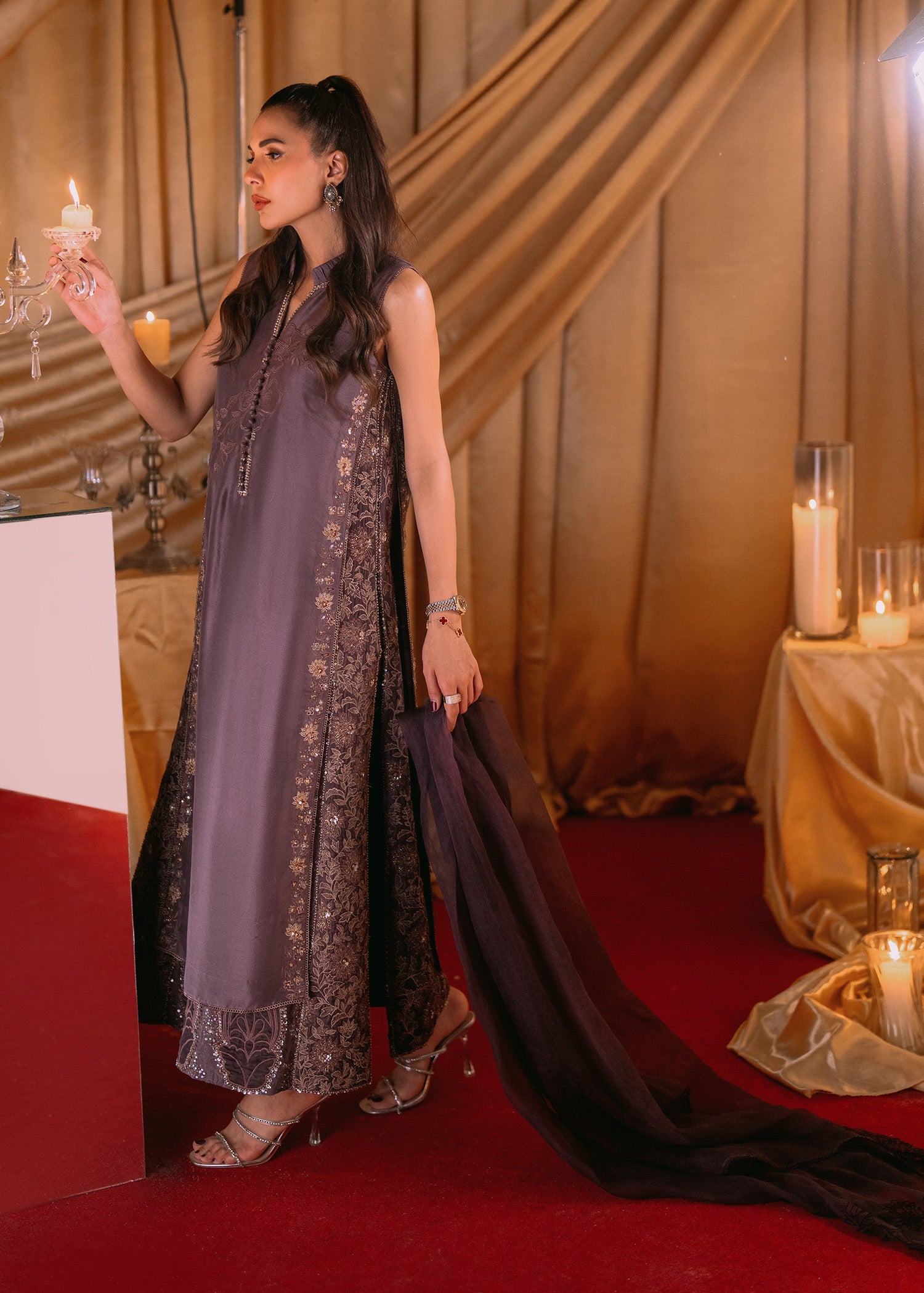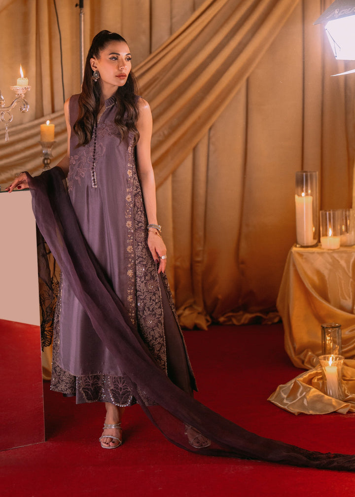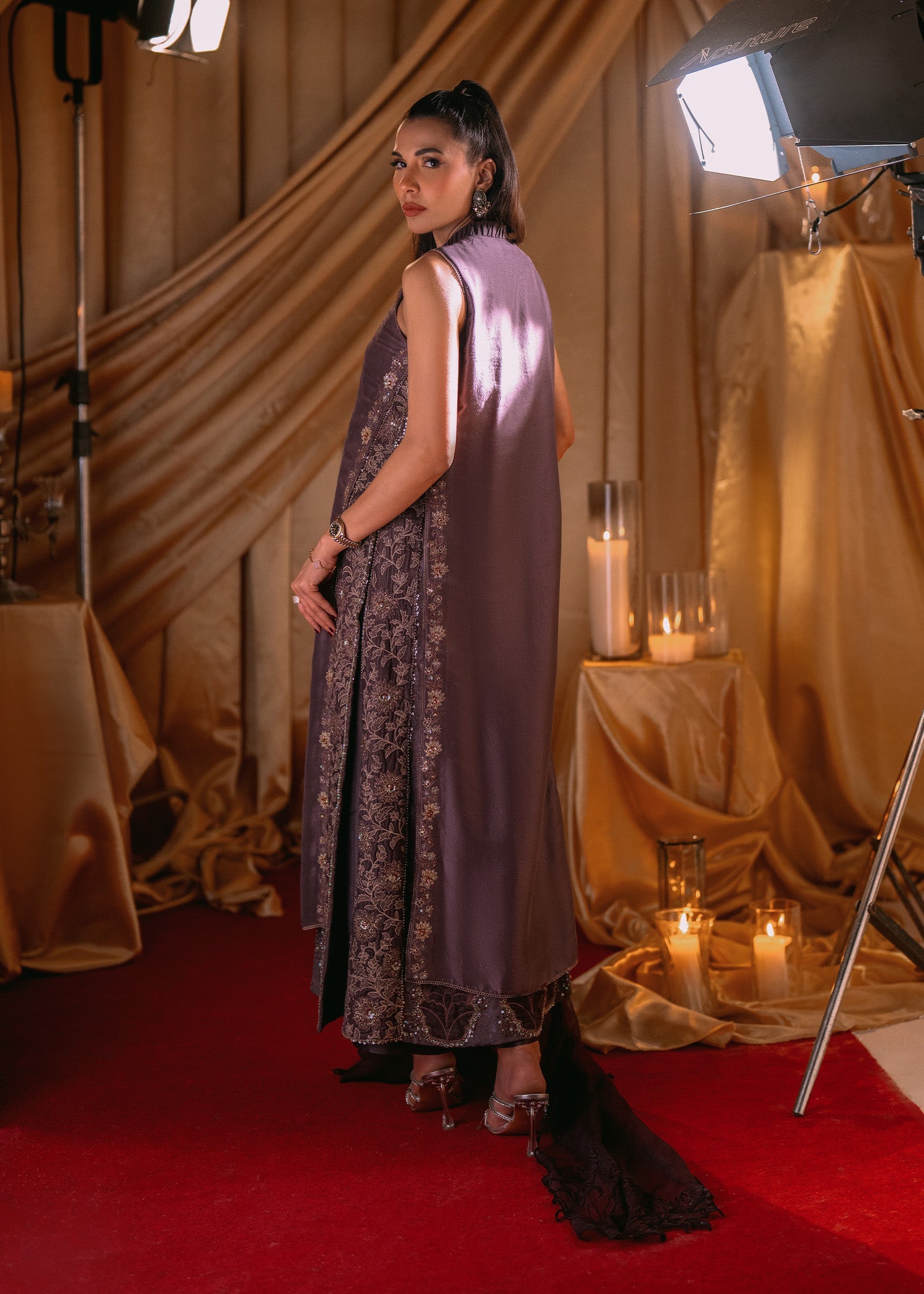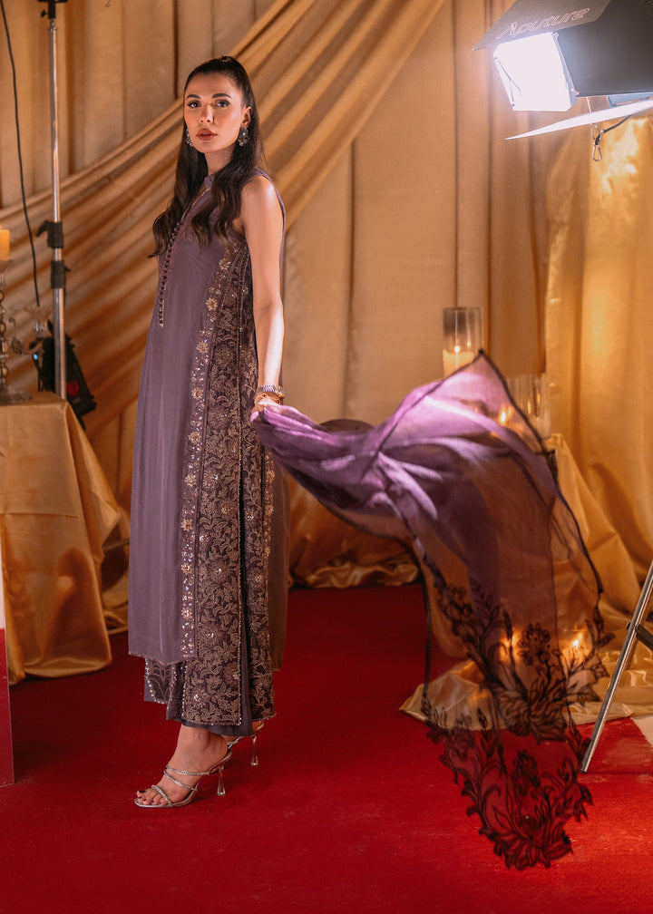 A double-layered shirt with manipulated collar, and intricate embroidery oh the front of the shirt highlighted by velvet-appliquéd bunches on the second layer of the shirt . Styled with pure silk classic culottes, the look is finished with a pure organza dupatta featuring embroidered corners for a classic touch.