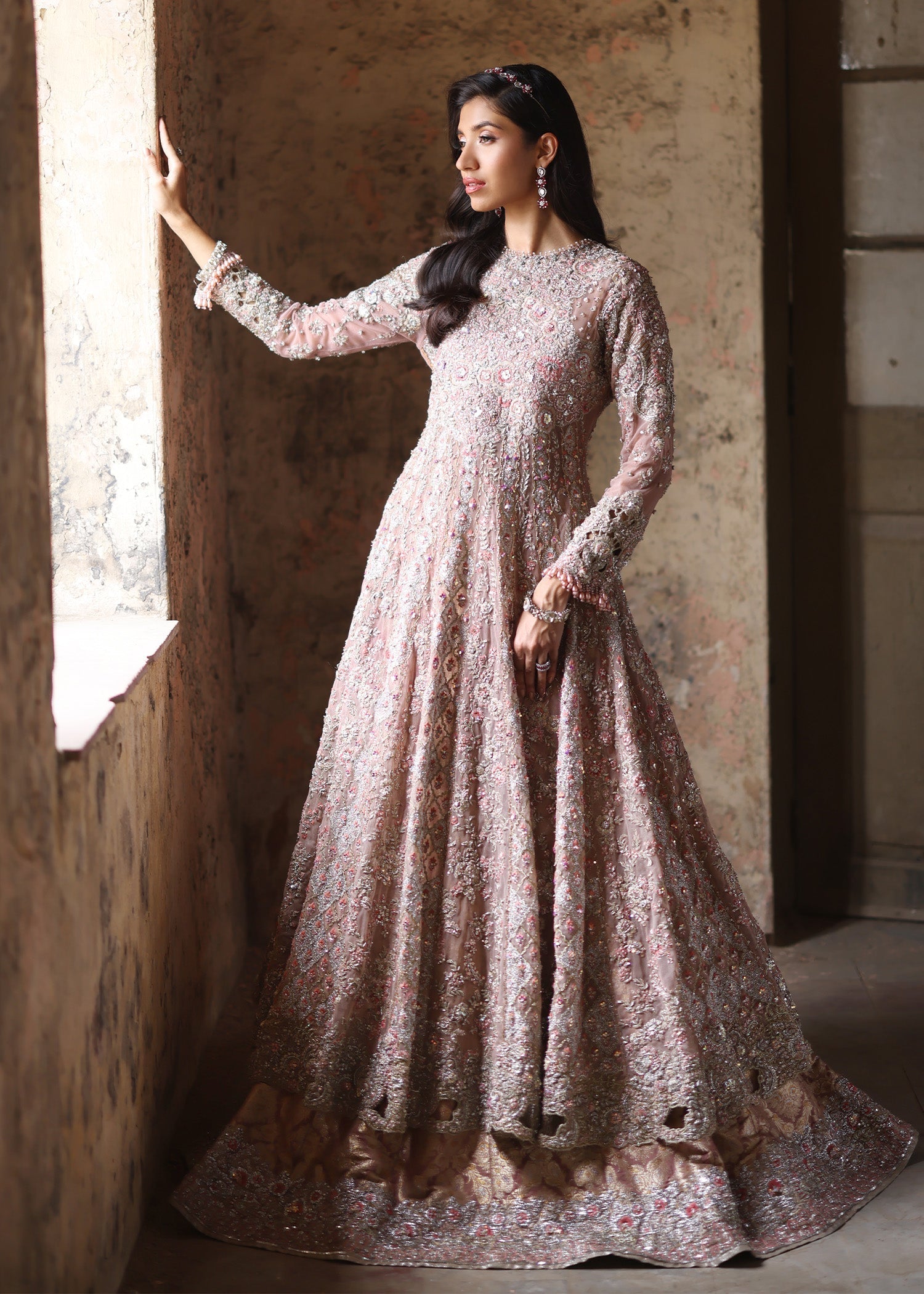 The Nude Pink French net gown is a stunning choice for any formal occasion. The delicate fabric and beautiful embroidery make it a truly unique and artistic piece.. Delicate handwork with kora dabka and stones is cascading across the whole gown. The inner lurex alongside loaded lame borders completes this ethereal ensemble paired with pure strawberry pink French net dupatta.