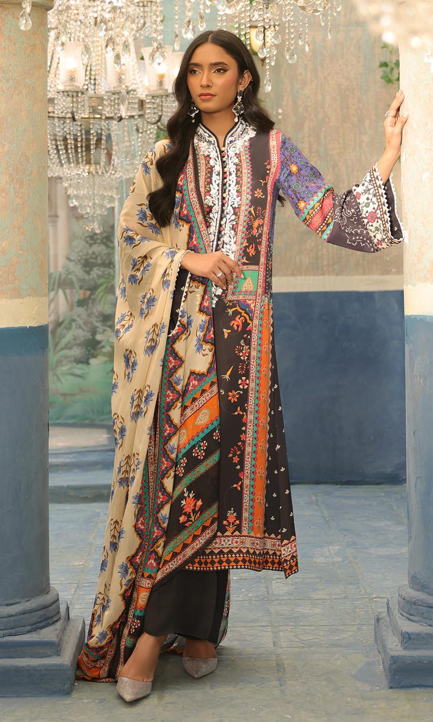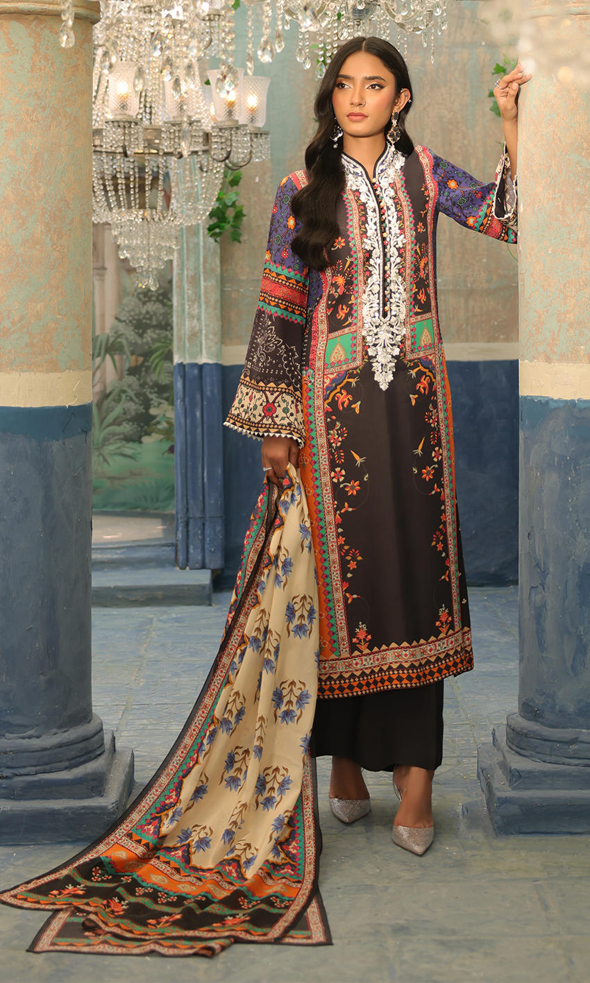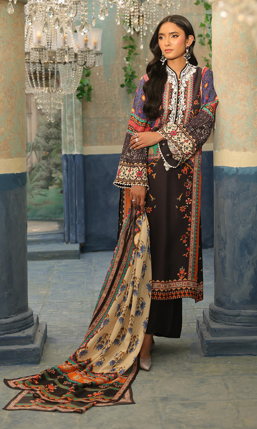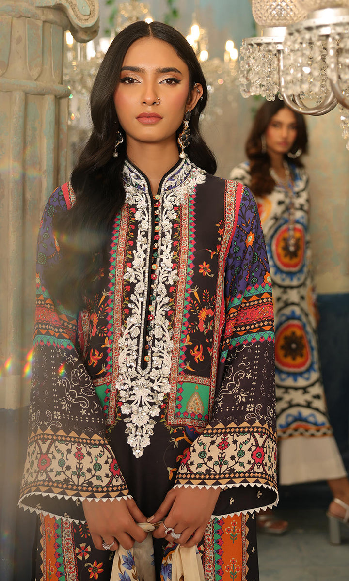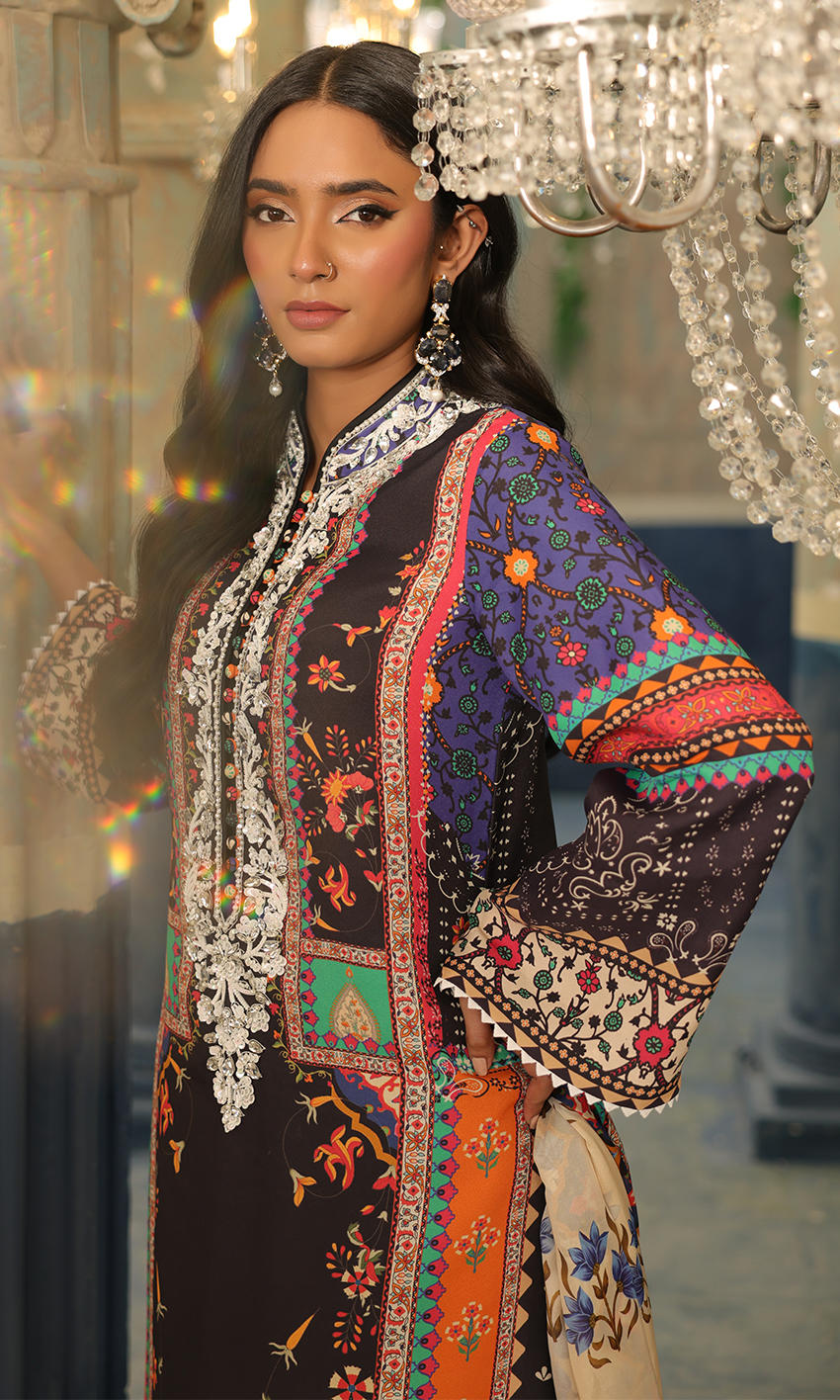 A cool dark hued print with contrasting white crystal neckline embellishment for finesse- an easy wearable piece for your wardrobe.