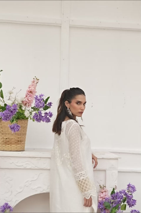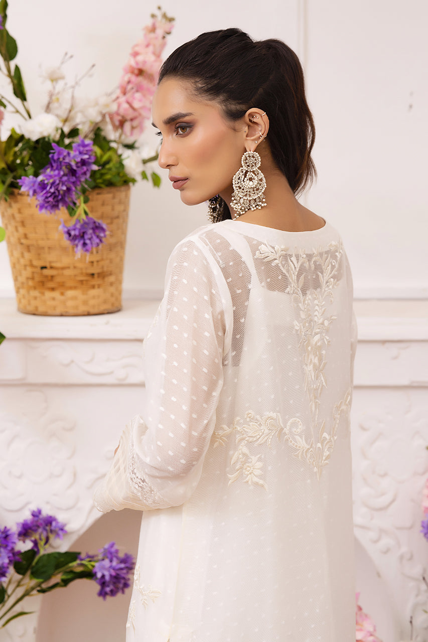 Introducing our stunning ensemble which is exquisitely fashioned from the finest khaddi net, this ensemble unfurls masterful machine embroidery on both its front and back canvases. Delicate whispers of organza detailing merge seamlessly with intricate lace accents. Paired with impeccably crafted straight trousers, this attire stands as a breathtaking testament to unparalleled sartorial elegance.