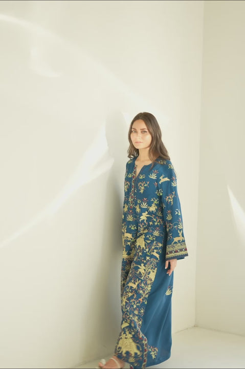 Cloaked in a deep teal hue, this pure rawsilk kaftan exudes regal charm with an exquisitely embroidered tapestry of flora and fauna, accented by Mughal inspired appliqué details. The fluid drape evokes timeless grandeur, while a delicately embroidered border elevates the neckline and sleeves. Paired with pure rawsilk trousers in a matching shade, the ensemble is a portrait of refined opulence.