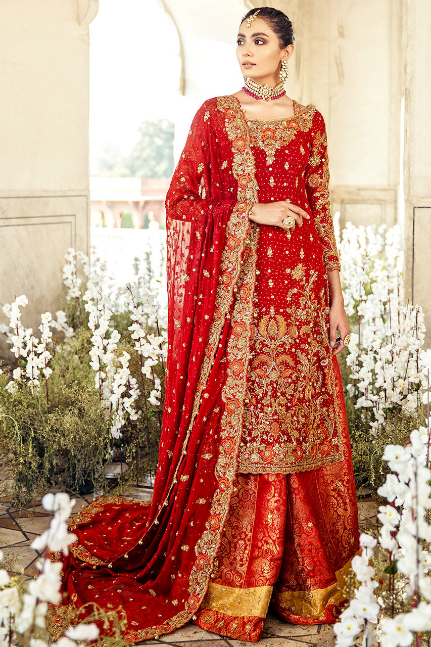 A beautiful symphony of colors is at play in this bridal dress. This elegant red Khaddi Silk shirt is heavily embellished with 3D zardozi and thread work flowers. Pair it with a heavily embellished cotton net dupatta that is enhanced with zardozi. Kamdani and sequins. An elaborate tri-coloured lehnga on gold, coral, and tangerine with hand embroidery adds to the exuberance of this bridal look.