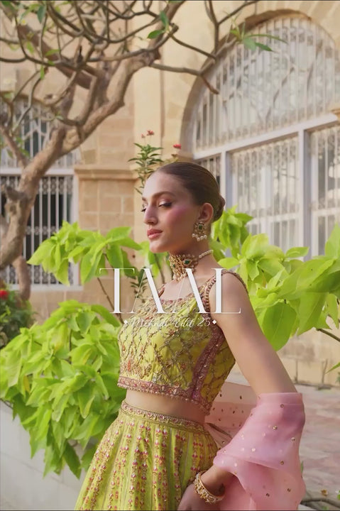 Bold yet beautifully balanced, this neon green digital silk bodice captivates with intricate all-over embroidery, blending modern vibrance with traditional artistry. The back features refined cutwork, accentuated with tassel hangings that lend movement and flair to the silhouette.