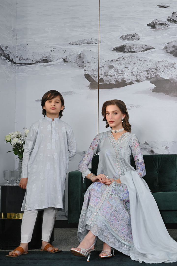 A refined dusty blue kalidaar, exquisitely crafted with fitted sleeves and detailed with embroidered organza borders and delicate lace accents. Paired seamlessly with tailored cigarette pants and a silk dupatta adorned with intricate lace borders.