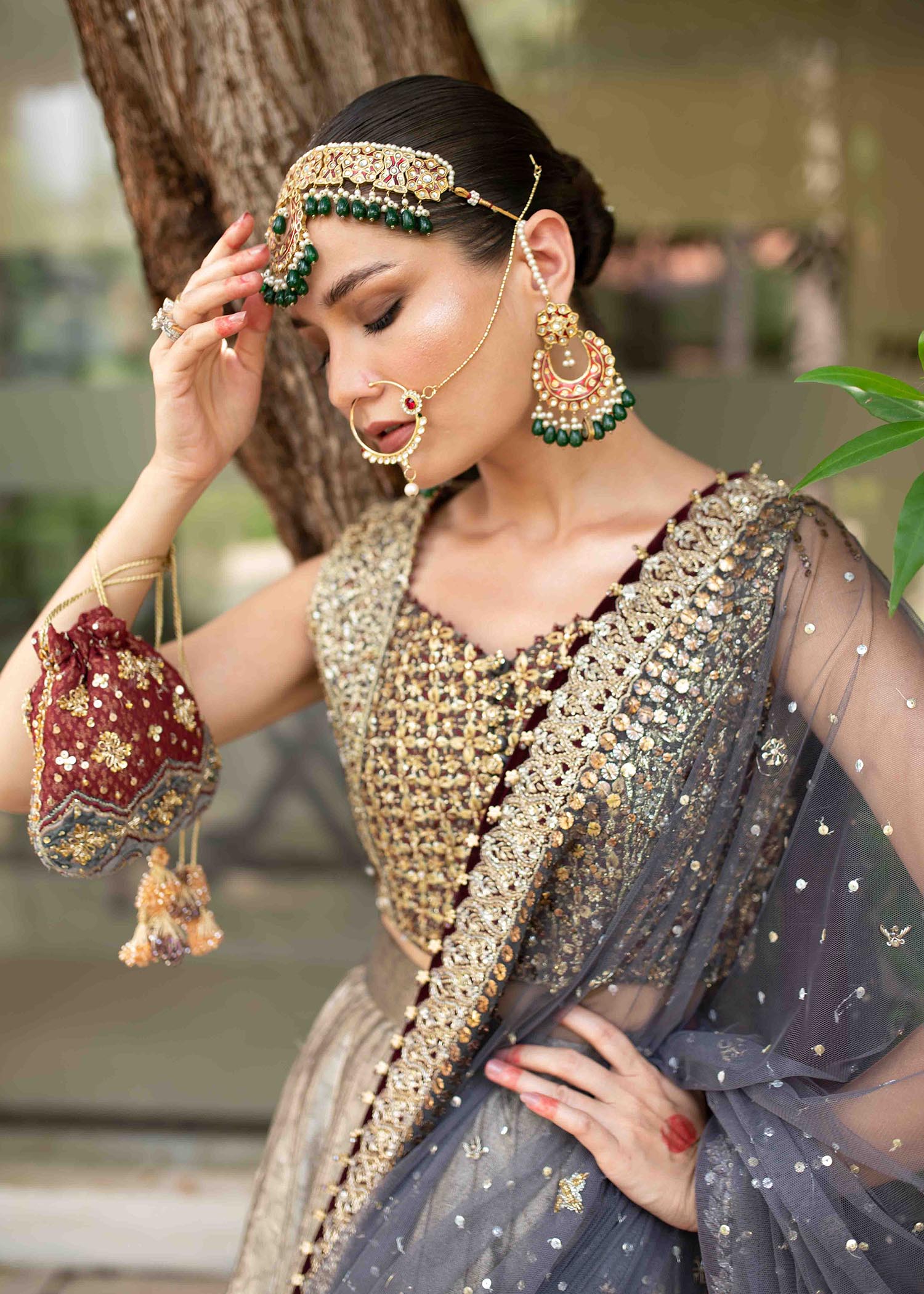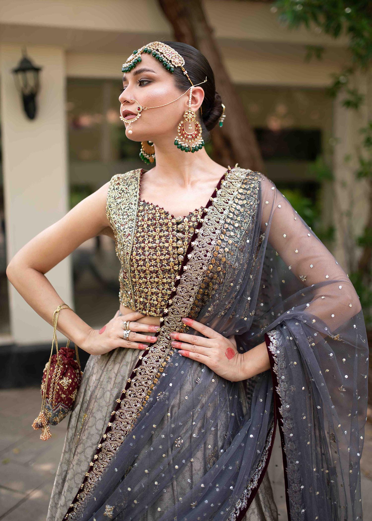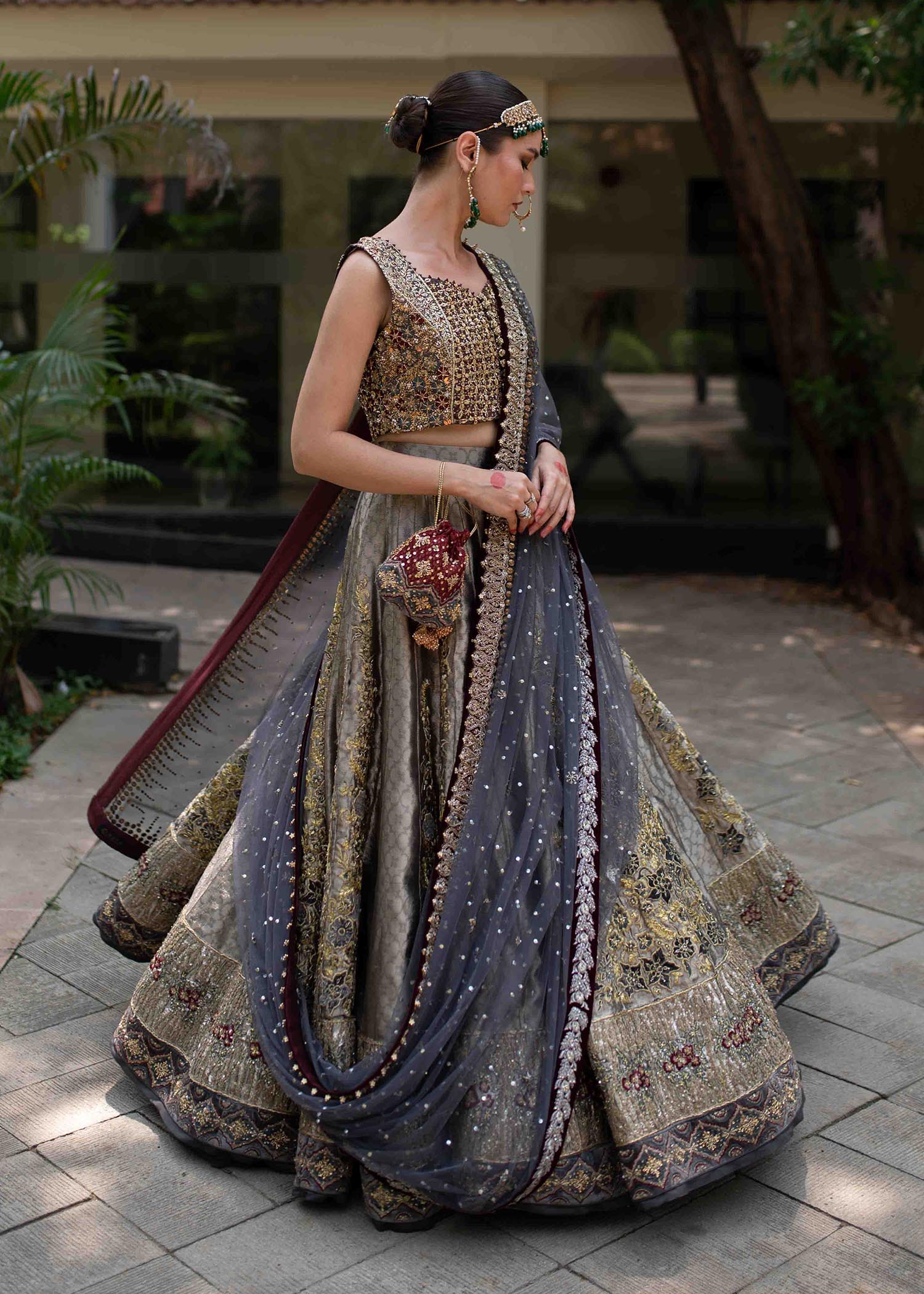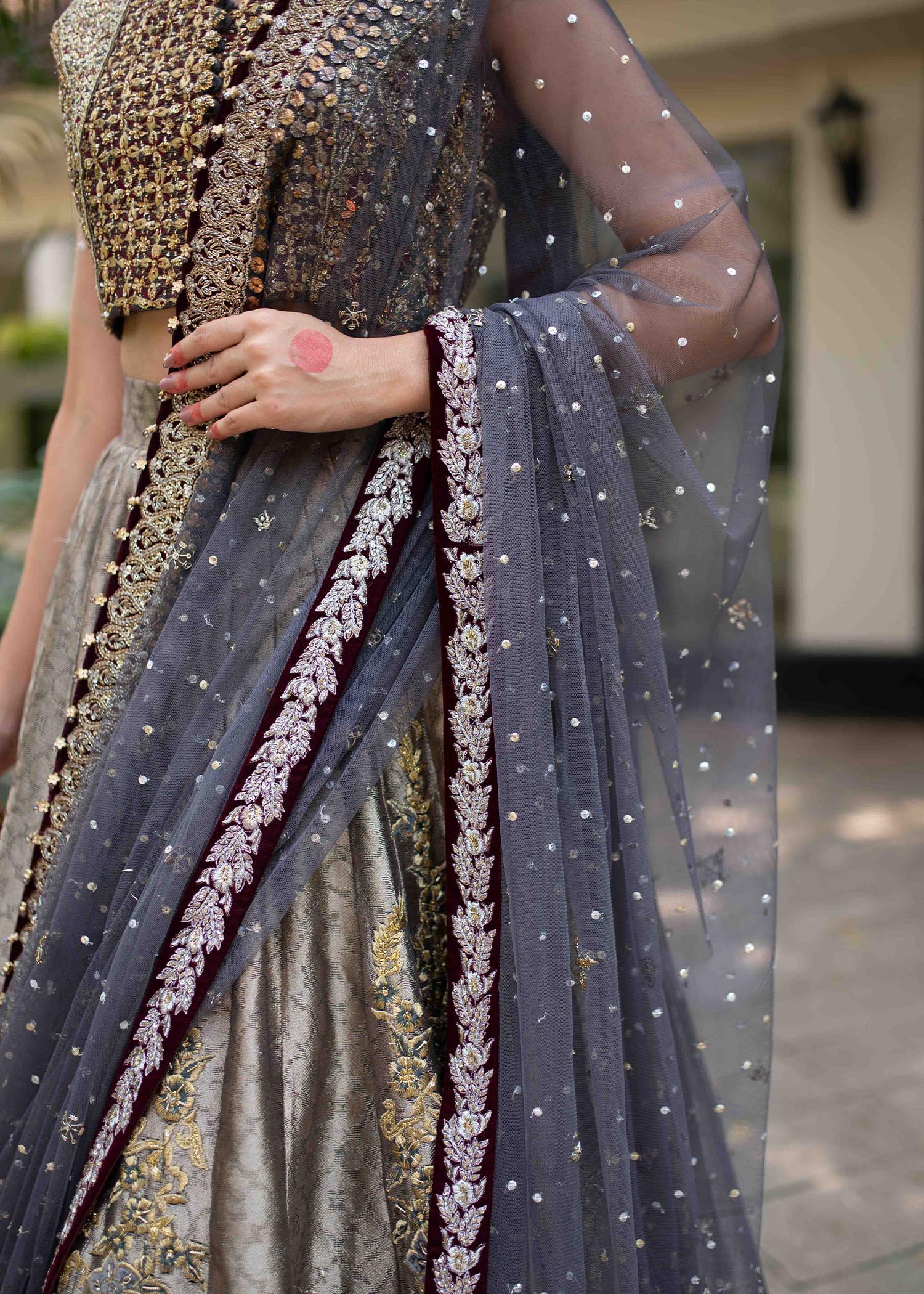 Includes: Blouse Lehenga Dupatta Fabric: Blouse: Pure silk mysore Lehenga: Pure french lame with velvet appliques Dupatta: Pure French Net Color: Charcoal gray and Cranberry red Description: Redefining luxury with...