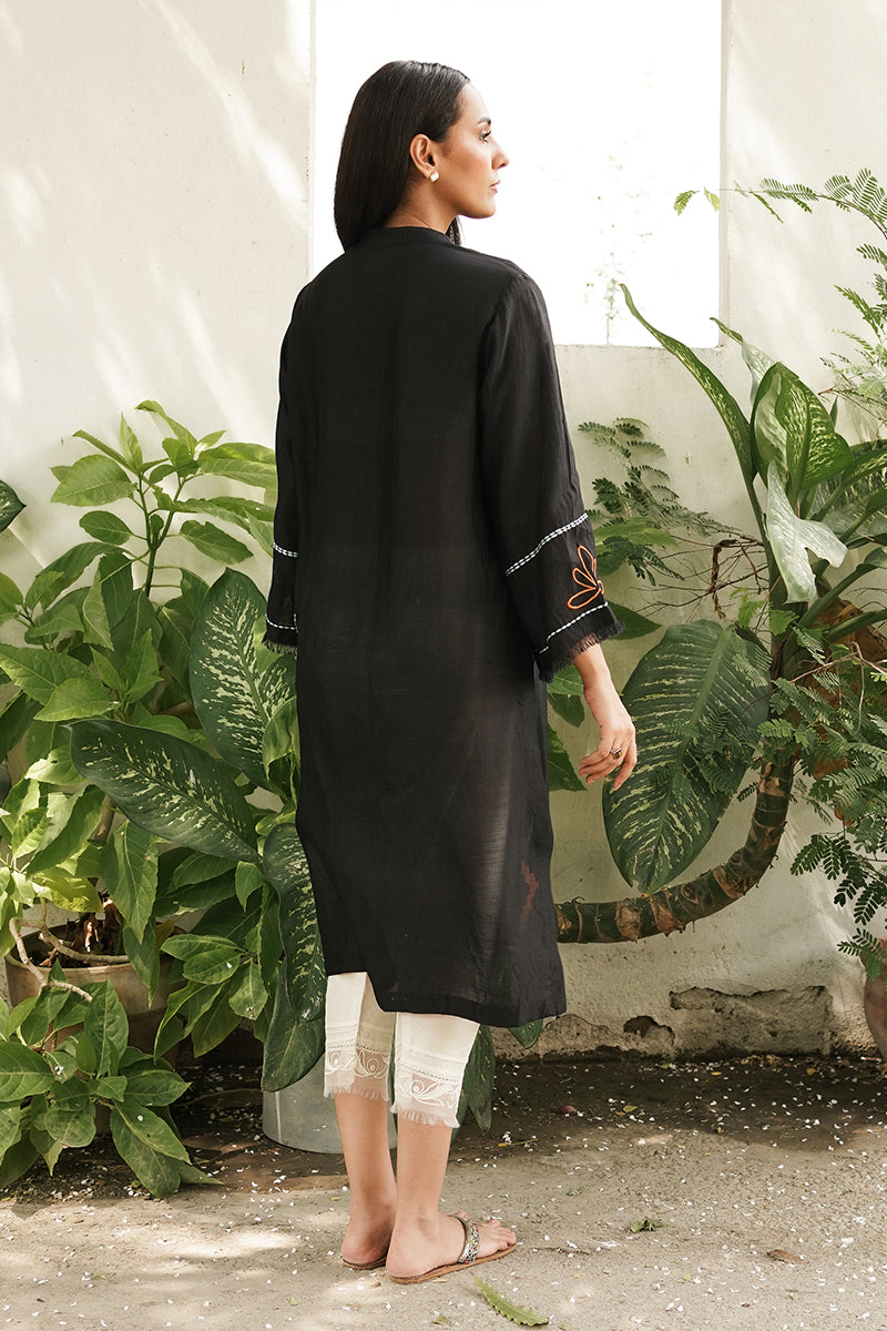 Yami kurta is an onyx black canvas with a ban collar and front open slit, making it a breezy silhouette perfect for summers. This design features signature applique and mirror work, tracing the lines of machine embroidery and running stitches over the kurta.