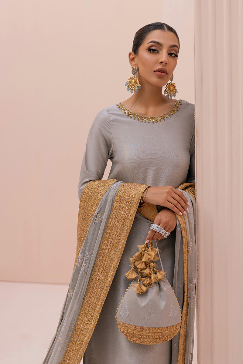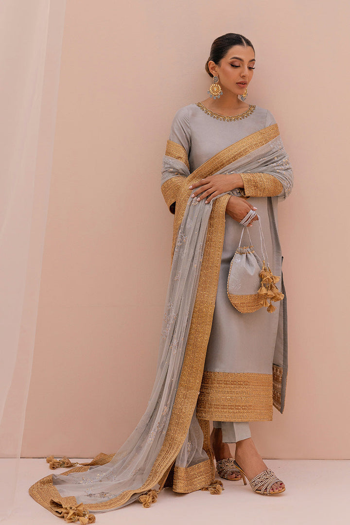 Made in luxe teal silk, this graceful outfit features delicate gota and zardozi kaam on the neckline. The complementary gold embroideries on the pants, sleeves, pouch and dupatta complete the...