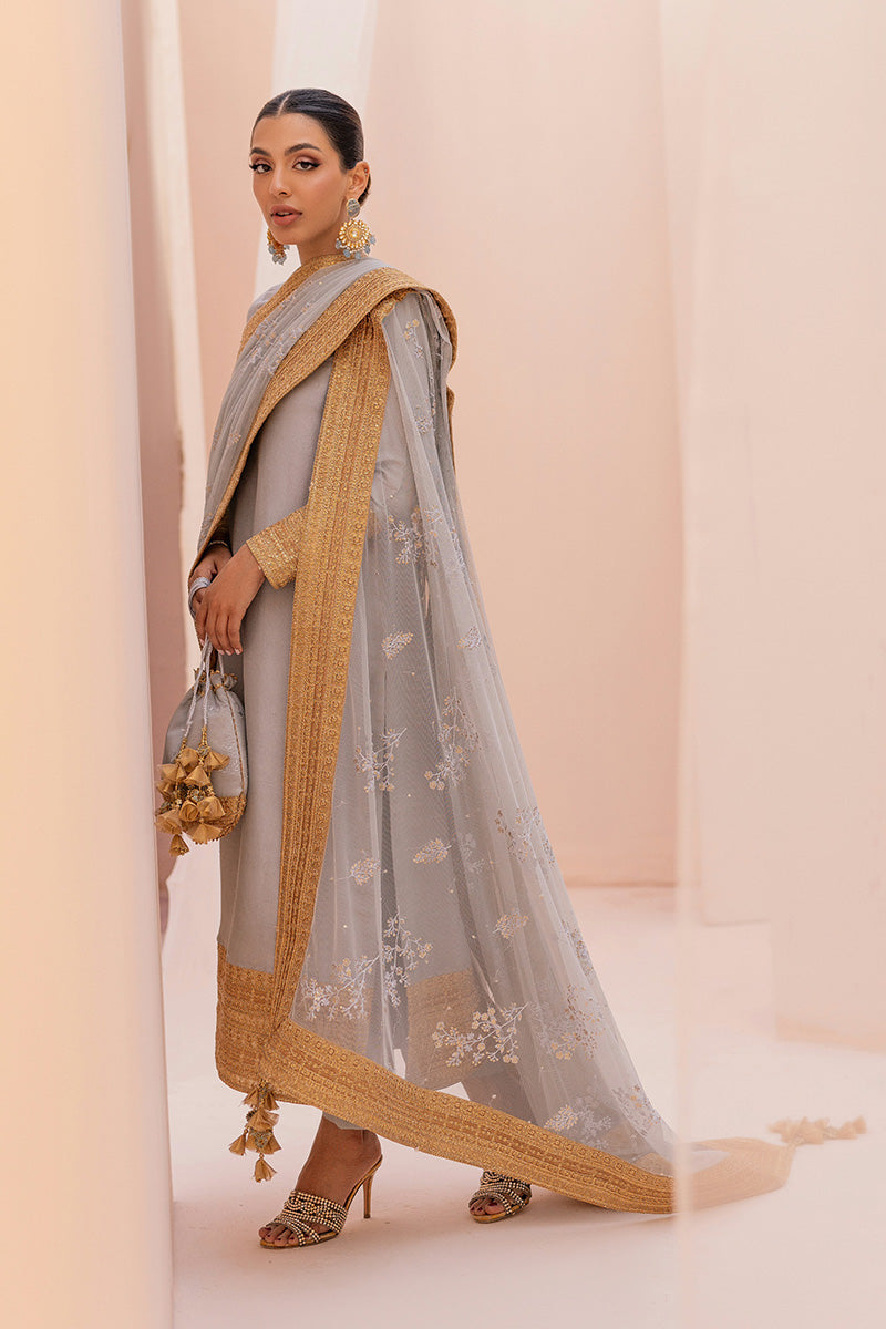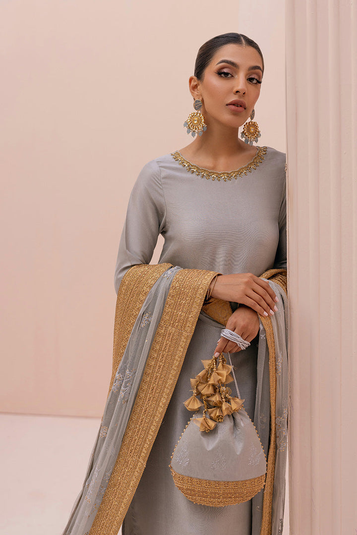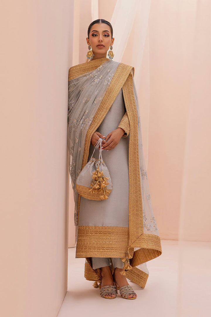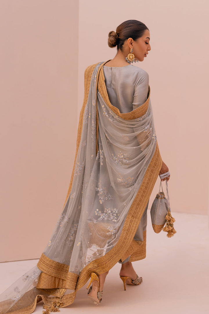 Made in luxe teal silk, this graceful outfit features delicate gota and zardozi kaam on the neckline. The complementary gold embroideries on the pants, sleeves, pouch and dupatta complete the outfit. Shirt and pants are included with dupatta being optional.