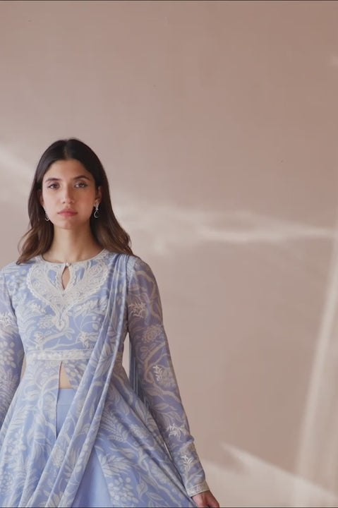 An attached draped dupatta elevates this front open, periwinkle hued chinoiserie printed peshwas, cut from georgette. The keyhole neckline and slim fit long sleeves are embroidered with ivory toned symmetrical floral vines, extending onto the statement heart shaped cutout at the back. The draped dupatta seamlessly melds into the voluminous flare, creating a poetic interplay of structure and fluidity.