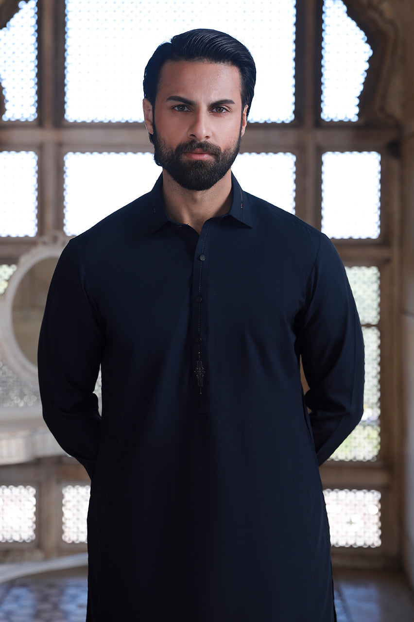 A navy blue, wash n wear kurta and shalwar designed with embroidery and button detailing on the neckline.