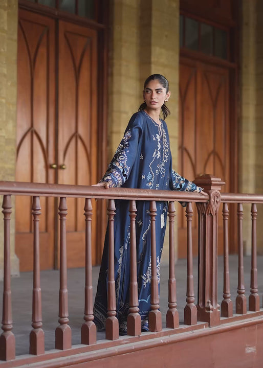 Flowing in a luxurious khaddi silk, this kaftan is adorned with intricate resham embroidery, mirror work, and refined applique detailing. The sleeves feature delicate cutwork and playful hangings that add movement and charm. Effortlessly elegant, this piece is a statement in relaxed sophistication.