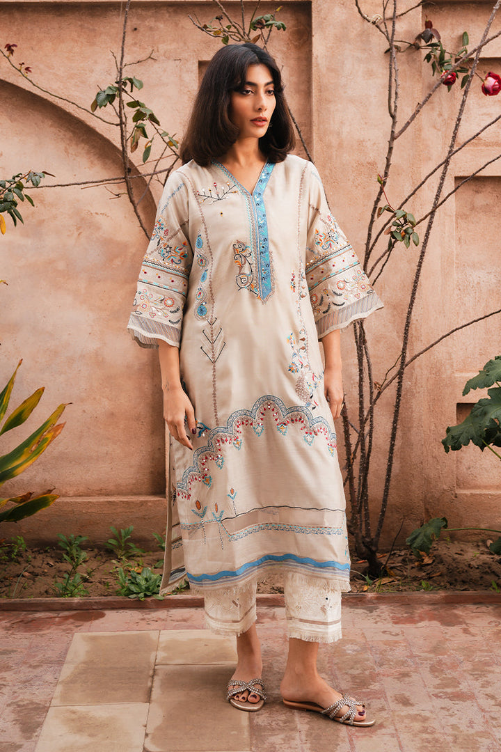 The Zara shirt embodies timeless elegance with its intricate craftsmanship. Designed in khadi silk, it features machine embroidery with resham, mirror work, and delicate applique detailing. Thoughtfully finished with precise...
