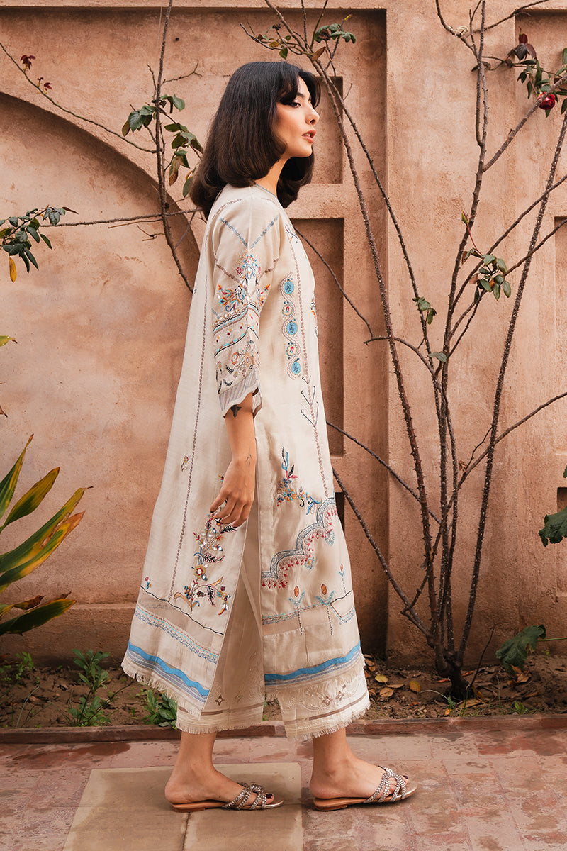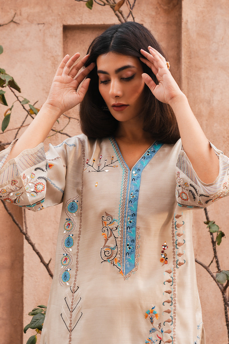 The Zara shirt embodies timeless elegance with its intricate craftsmanship. Designed in khadi silk, it features machine embroidery with resham, mirror work, and delicate applique detailing. Thoughtfully finished with precise stitches, pleats, and subtle shredding, this piece blends sophistication with a touch of contemporary texture.